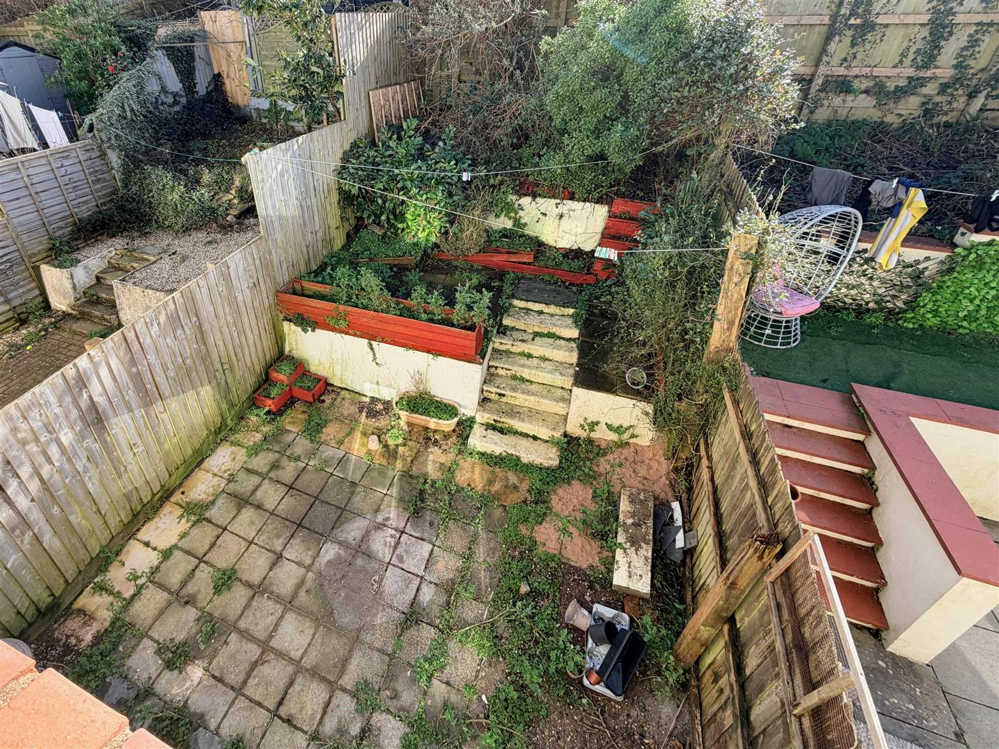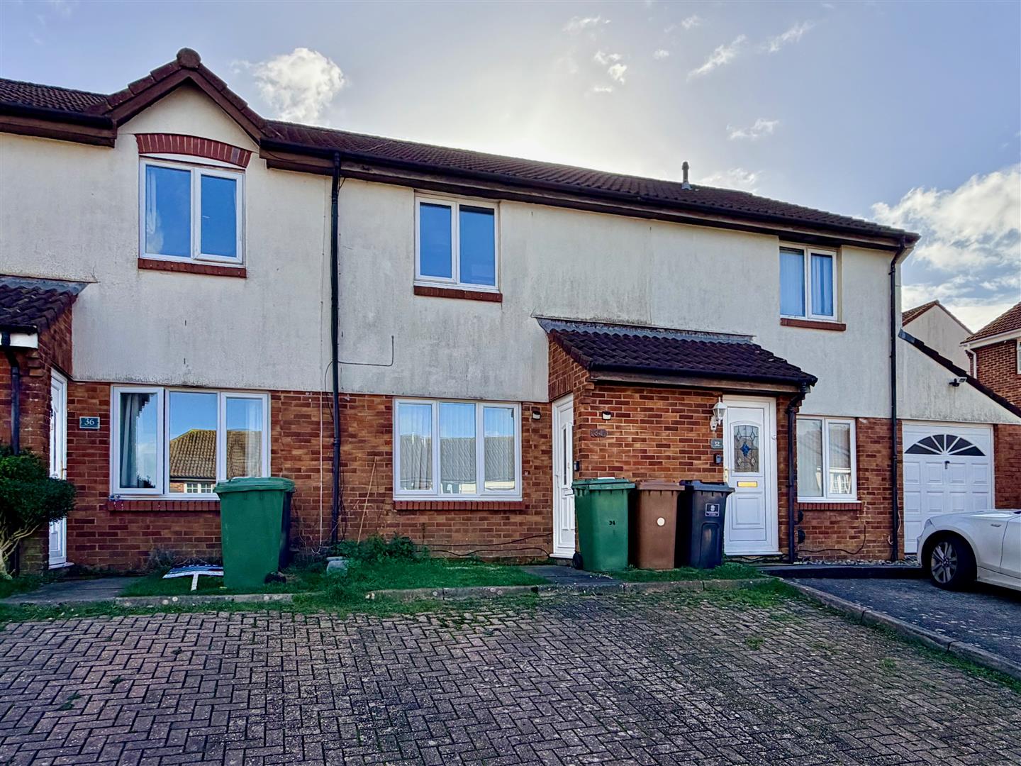 To the front there is a small area of garden leading to the main front door. Paved parking with 2 allocated parking spaces. The rear garden is laid to patio, plus a raised area with shrubs.