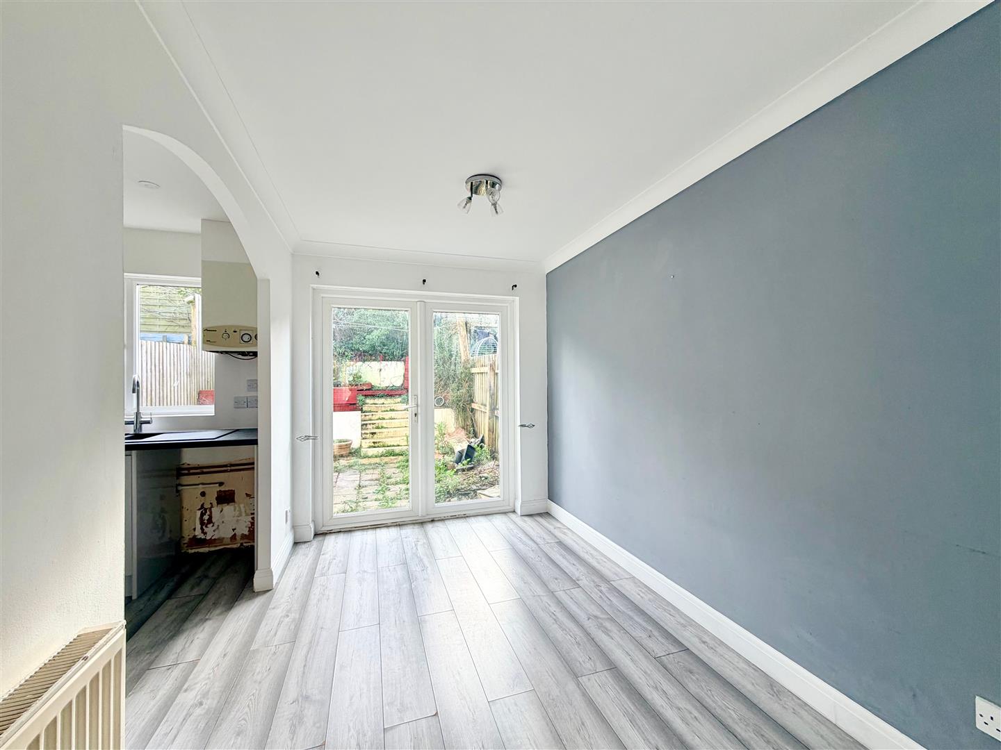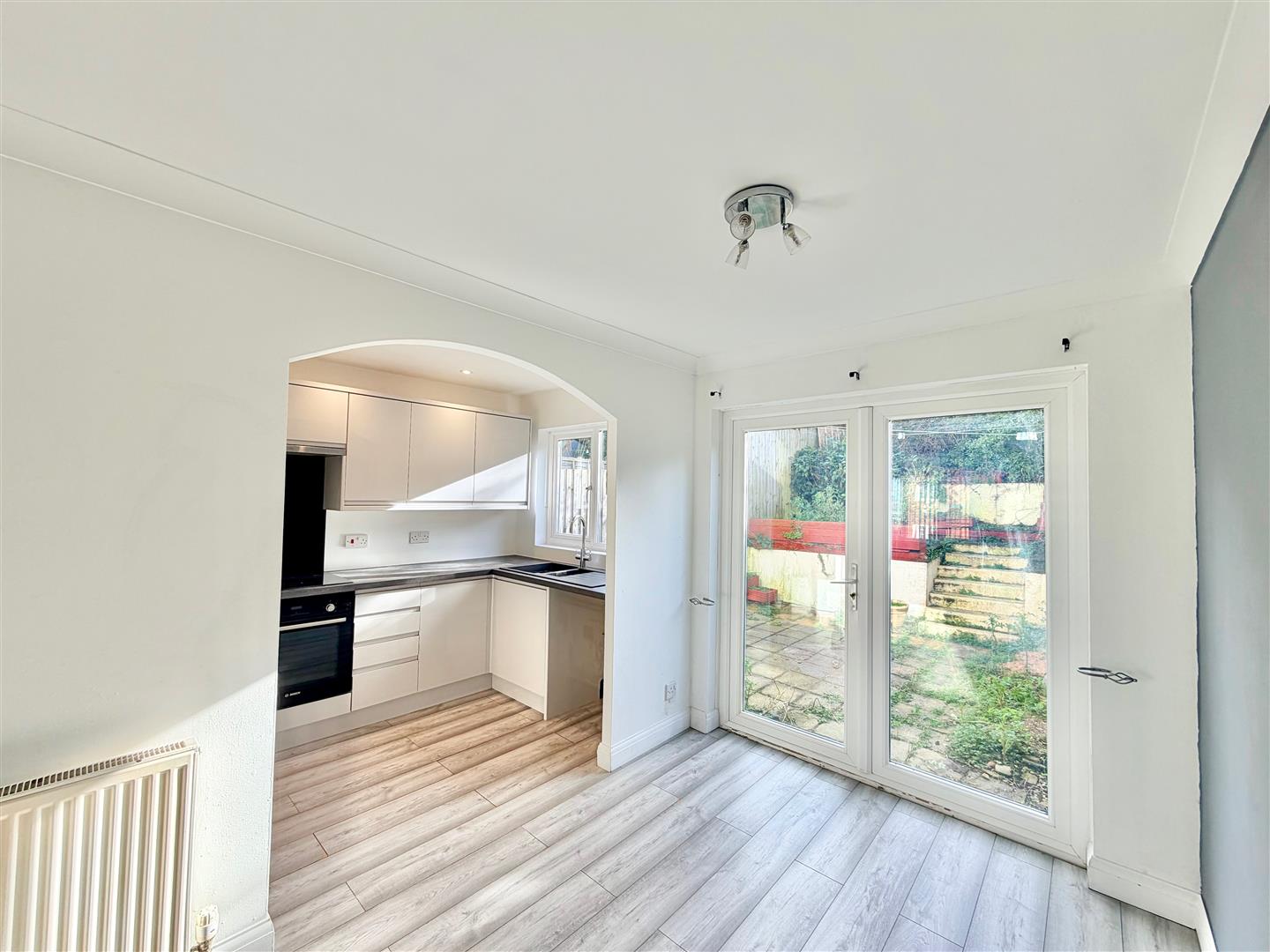 The dining area has ample space for table and chairs. French doors open onto the garden. The kitchen is fitted with a range of modern grey gloss-faced kitchen cabinets with contrasting work surfaces. Inset one-&-a-half bowl sink. Built-in oven and hob. Integrated dishwasher. Space for free-standing fridge-freezer. Space for washing machine and tumble dryer. Wall-mounted Worcester gas boiler. Window to the rear elevation.