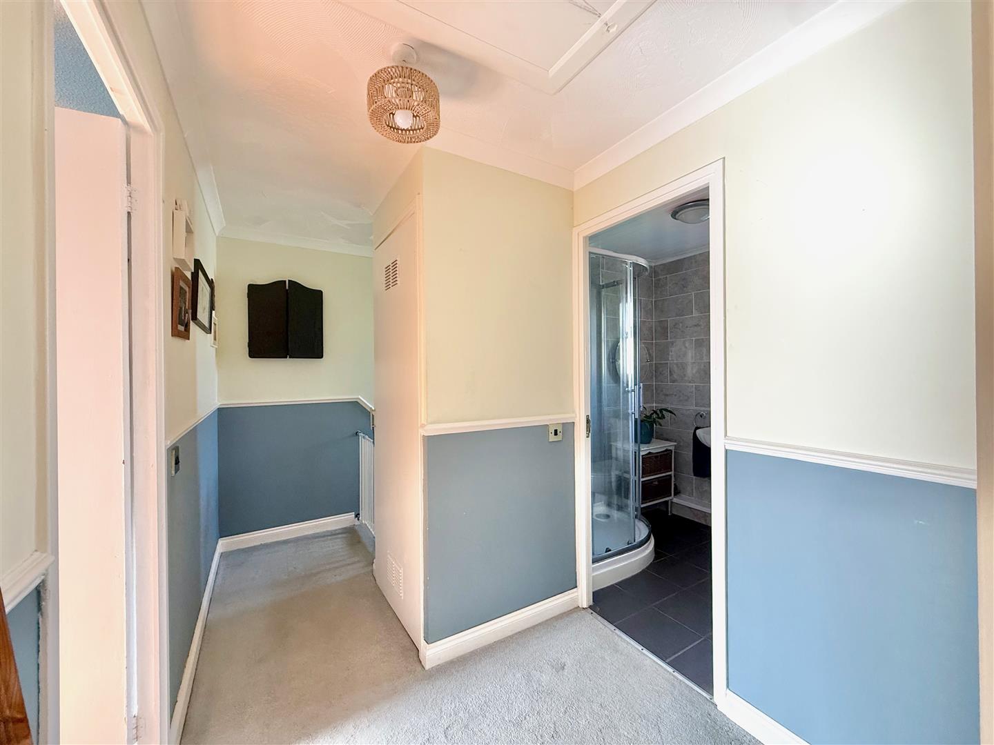 Providing access to the first floor accommodation. Loft hatch. Built-in cupboard with slatted shelving and housing the gas boiler.