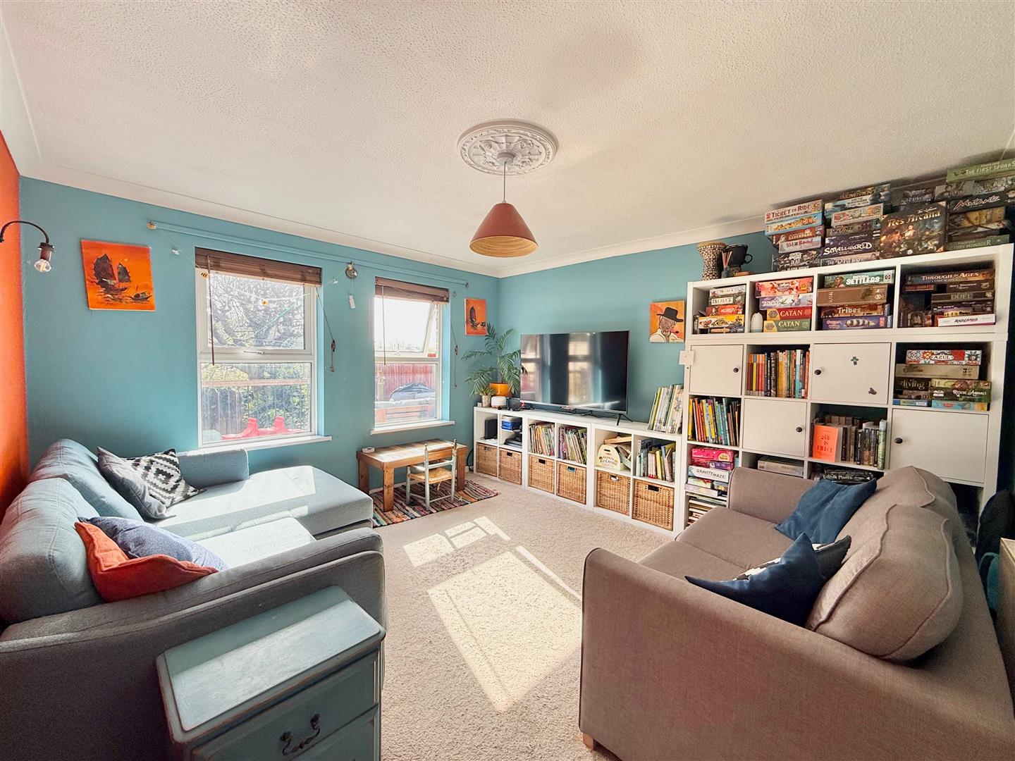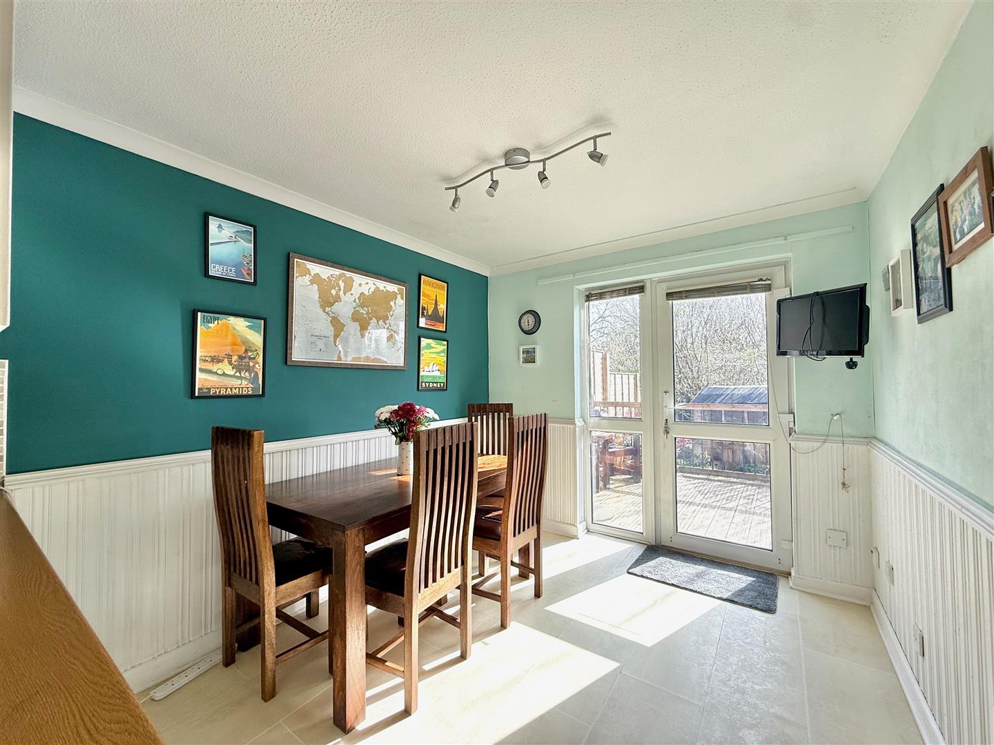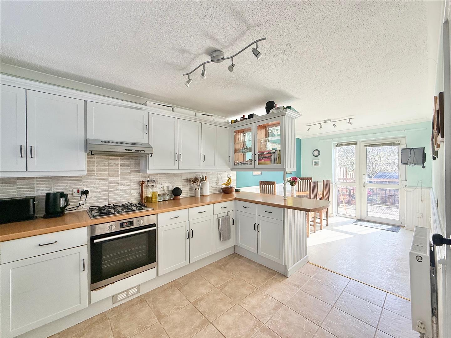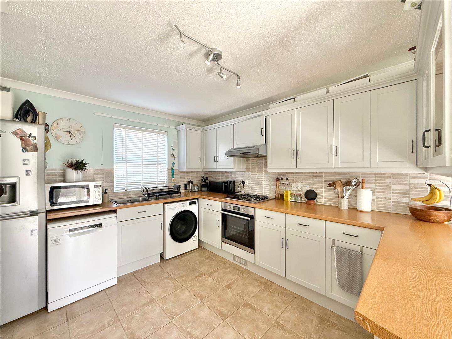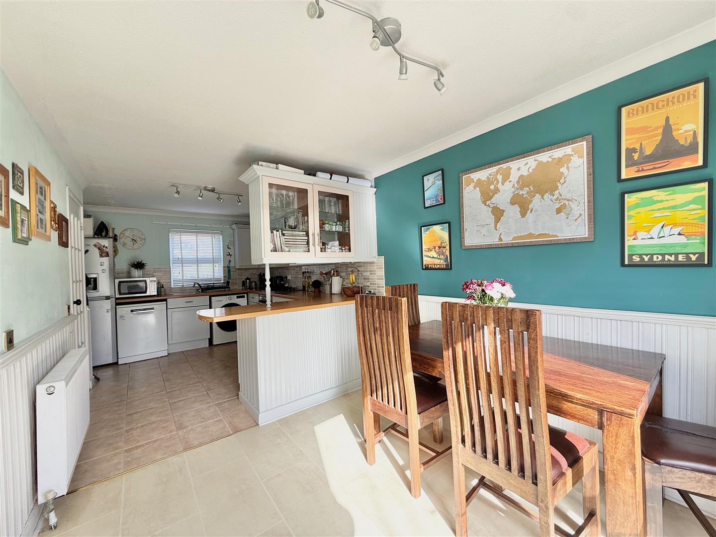 An open-plan dual aspect room running from front to rear with windows with fitted blinds to both the front and rear elevations. Glazed door with a fitted blind leading to the rear garden. The dining area is situated to the rear and has ample space for table and chairs. The kitchen is fitted with base and wall-mounted cabinets with matching fascias, work surfaces and tiled splash-backs. Inset stainless-steel single drainer sink unit. Built-in oven. Separate stainless-steel 4-burner gas hob with a cooker hood above. Space for dishwasher, washing machine and fridge-freezer. Tiled floor within the kitchen area and laminate flooring within the dining area.