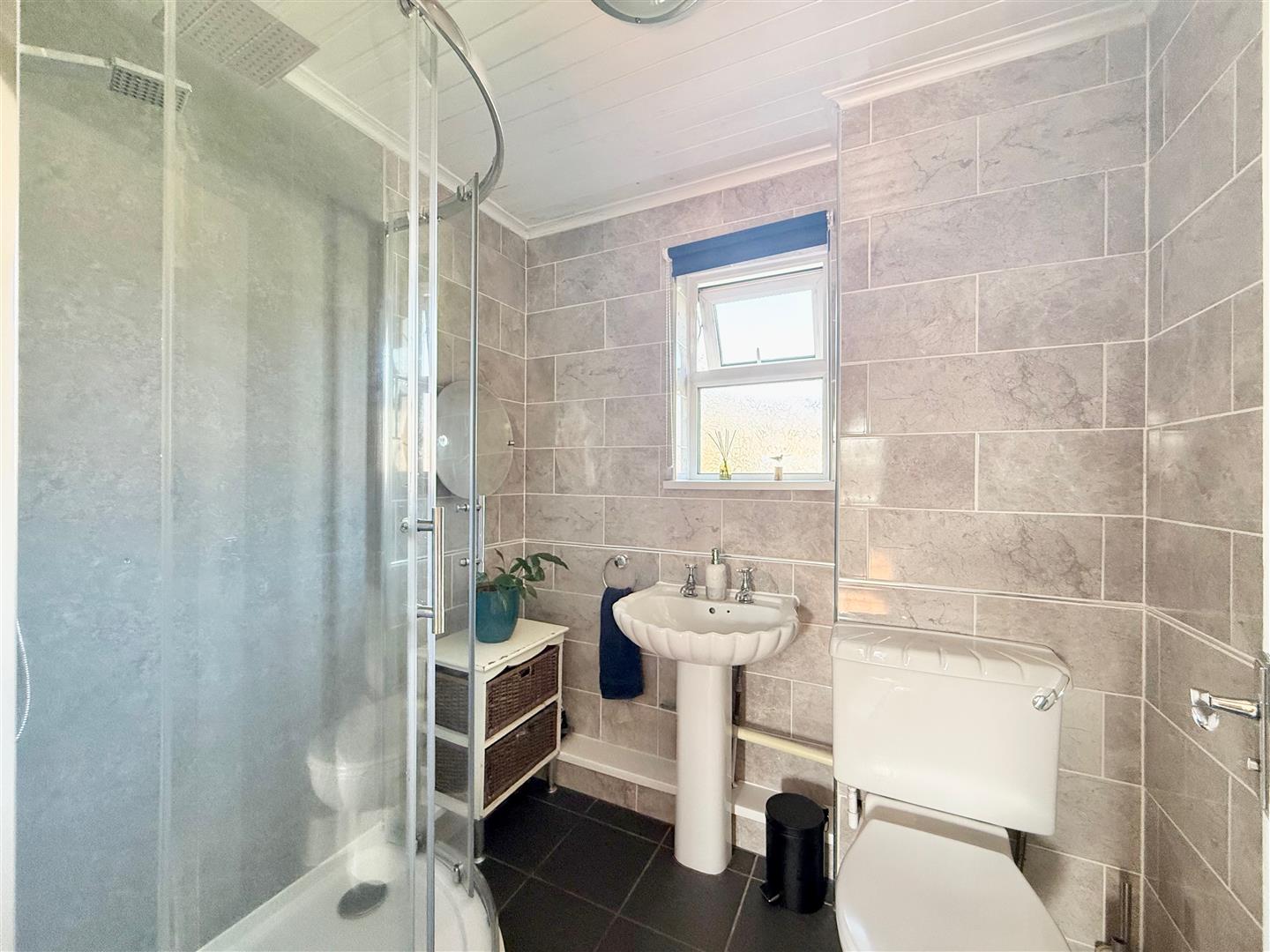 Comprising an enclosed shower with waterproof panelling and a curved glass screen, pedestal basin and wc. Towel rail/radiator. Tiled floor. Fully-tiled walls. Obscured window to the front elevation.