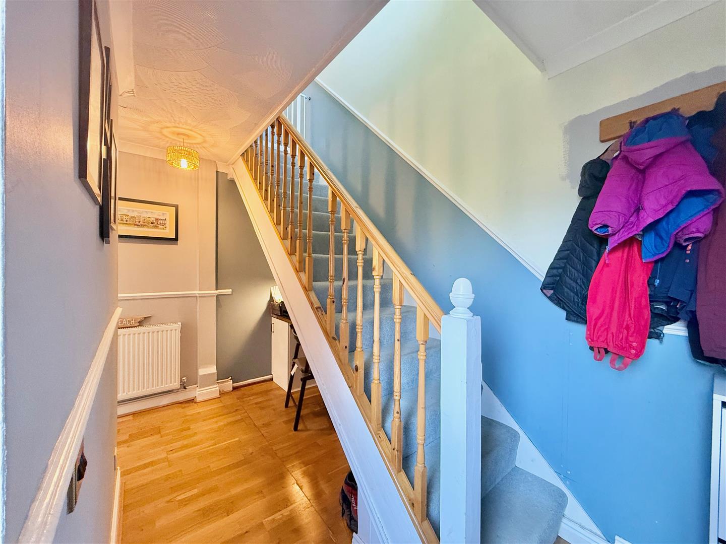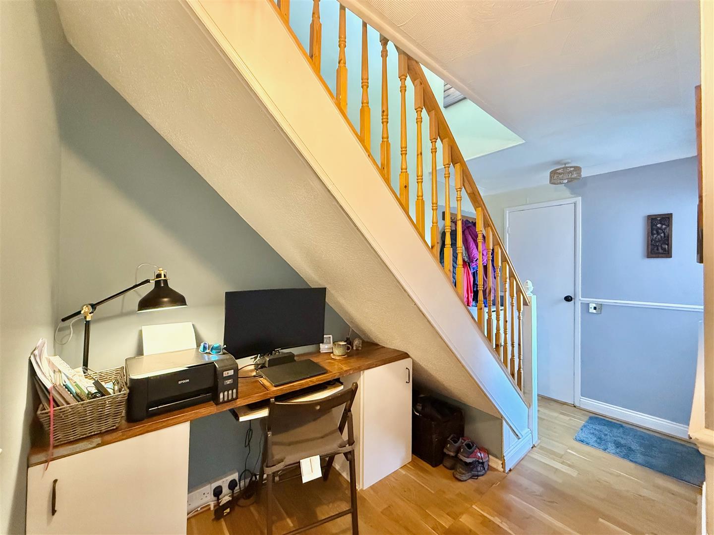 Doors providing access to the ground floor accommodation. Stairs rising to the first floor. Open-plan area beneath the stairs. Recessed storage cupboard. Hard wood flooring.