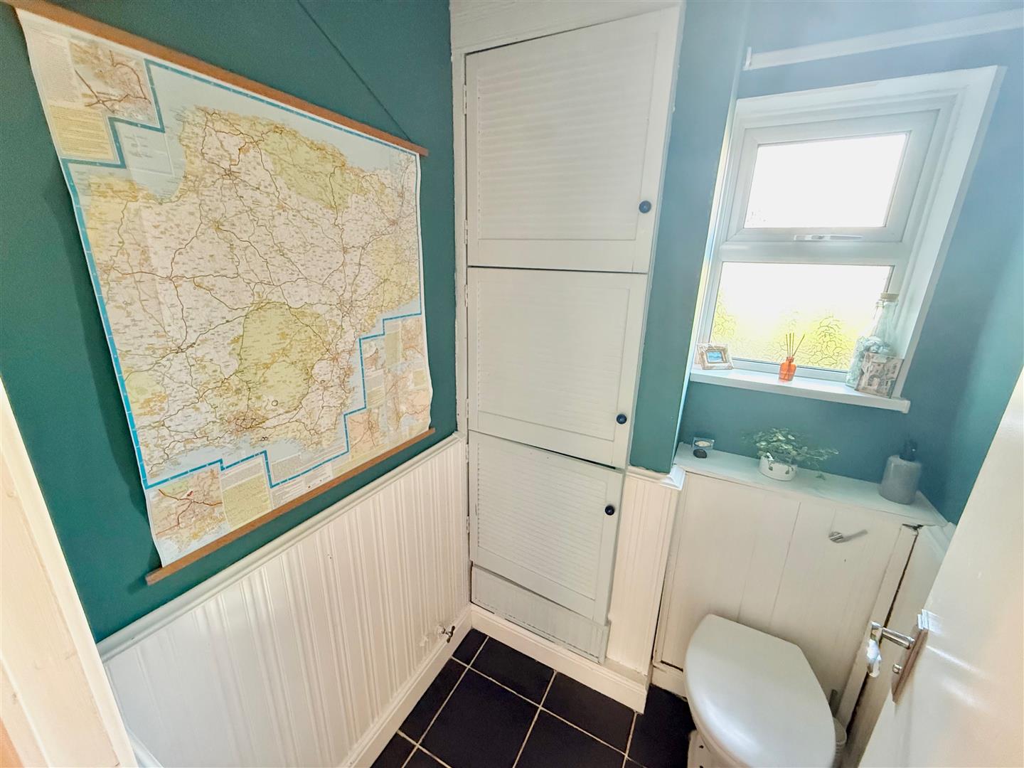 Fitted with a wc and wash hand basin with a tiled splash-back. Storage cupboard with shelving. Tiled floor. Obscured window to the front elevation.