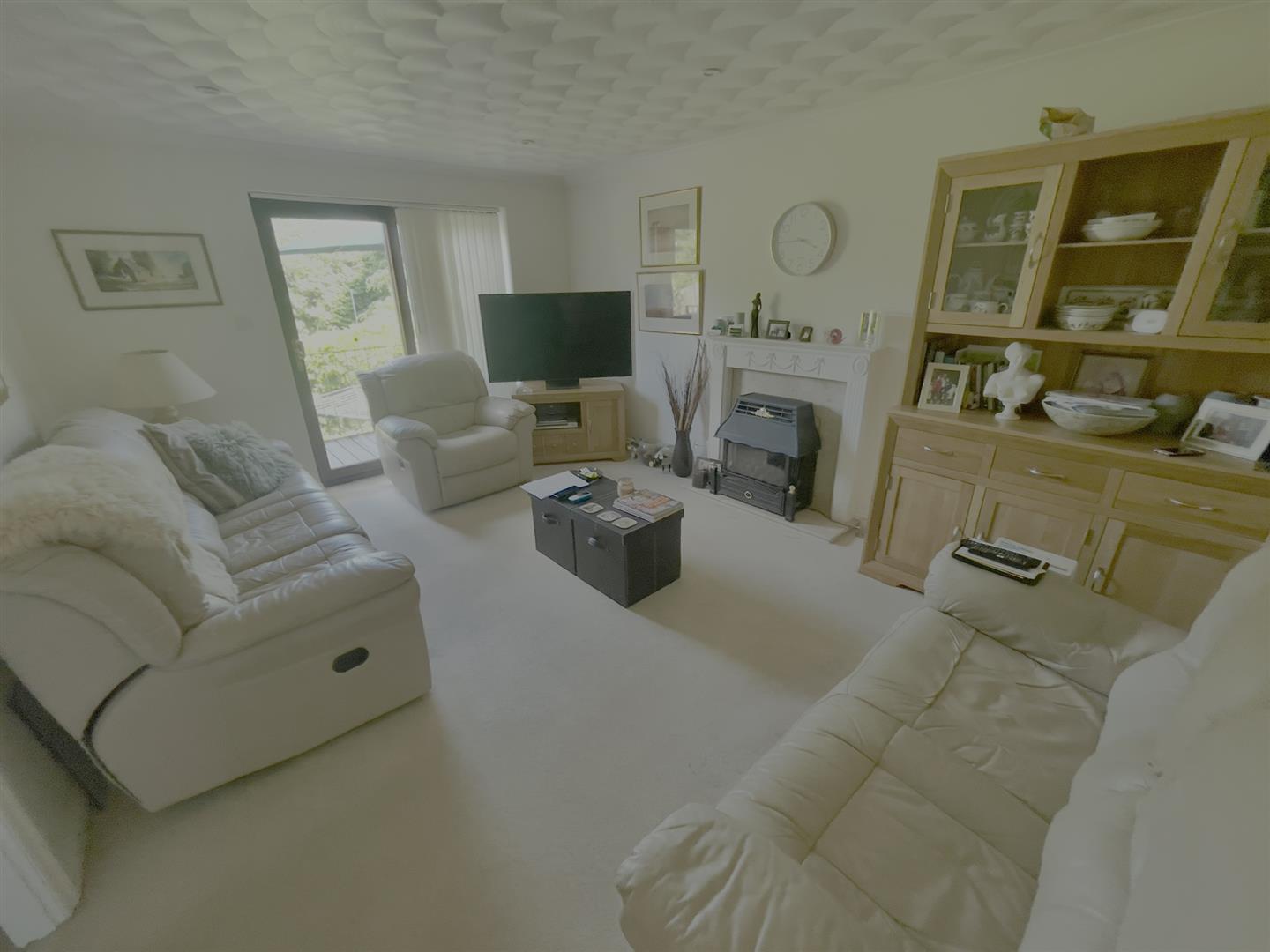 Window & sliding patio style door to the rear deck & garden with open views to the park. Ceiling with down lighters. Focal feature fireplace with white surround. Polished stone fireback & hearth & fitted living flame coal effect gas fire. Muilt-pane glazed door into;