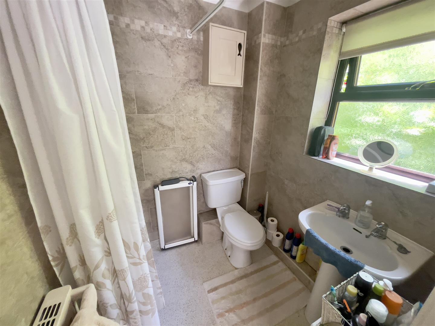 uPVC double-glazed window to the side. Modern white suite with pedestal wash hand basin, wc & wet room style shower with thermostatic shower control. Extractor fan.