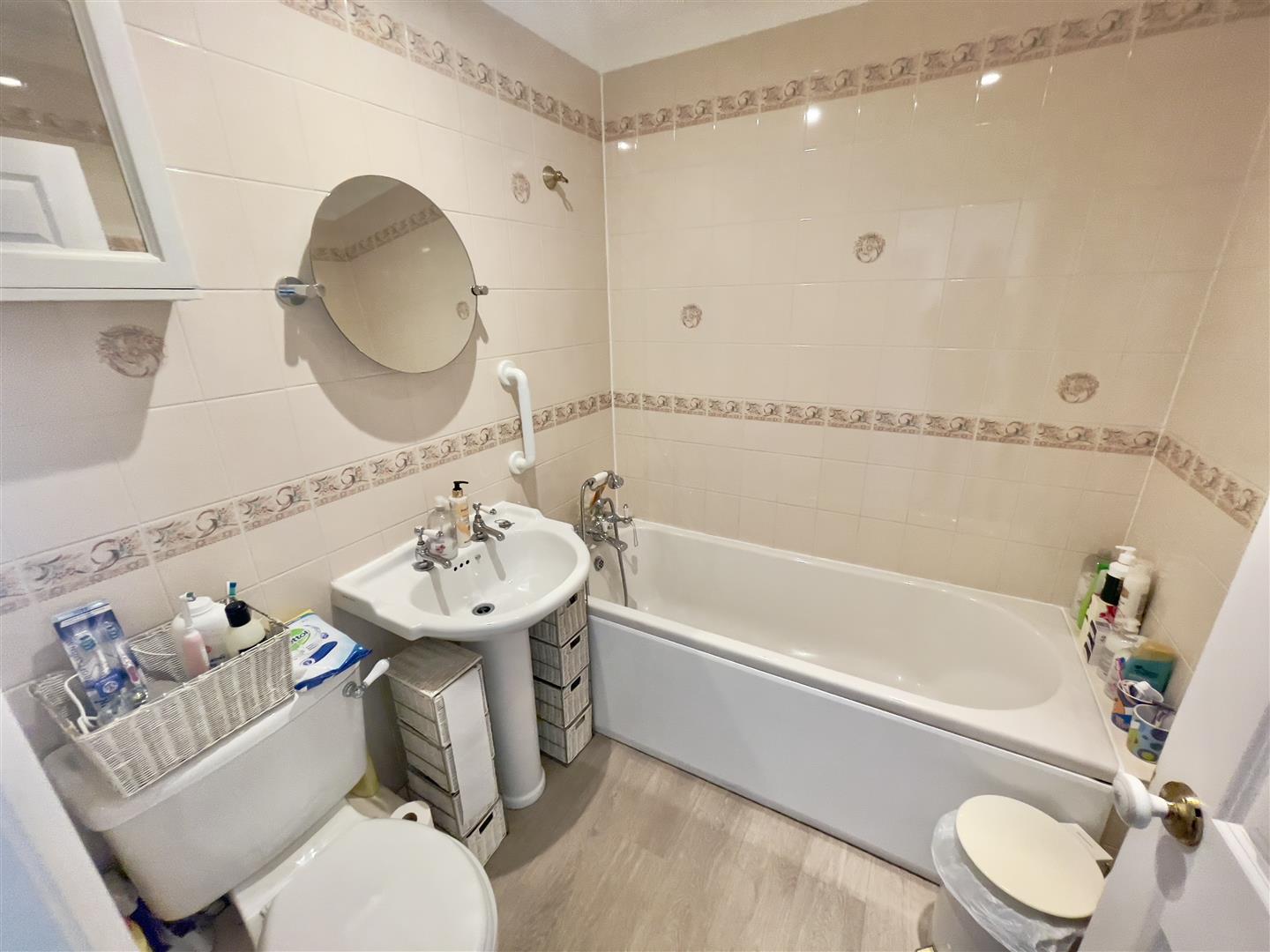 Well appointed with white suite comprising close coupled wc, pedestal wash hand basin & panelled bath with mixer tap & shower attachment. Tiled walls.