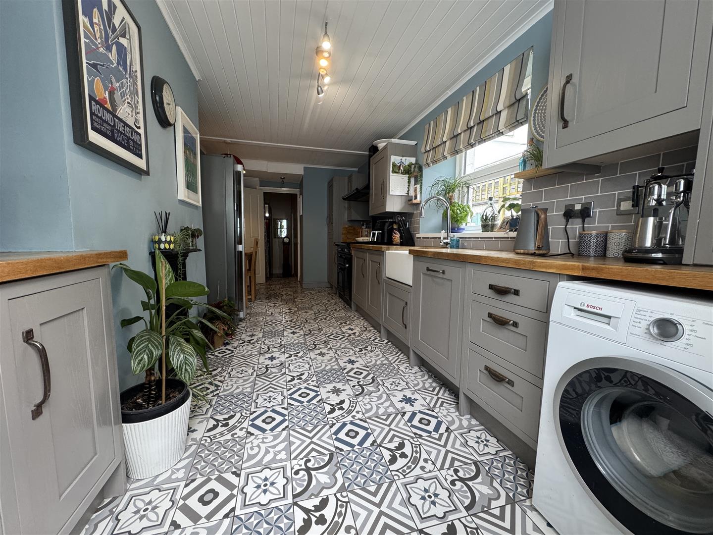 Attractive matching base & wall mounted units to include a space for Rangemaster cooker with fitted Rangemaster extractor hood over, integrated dishwasher & a position for a washing machine. Roll edge worktops have inset Belfast sink with mixer tap. Tiled splash-back. Range master extractor hood. Position for an American fridge/freezer. Wall mounted Ideal Logic boiler which is concealed in a cupboard. Feature decorative fireplace. Tiled floor. uPVC double-glazed window to the side. uPVC double-glazed French doors opening out to the covered garden area.