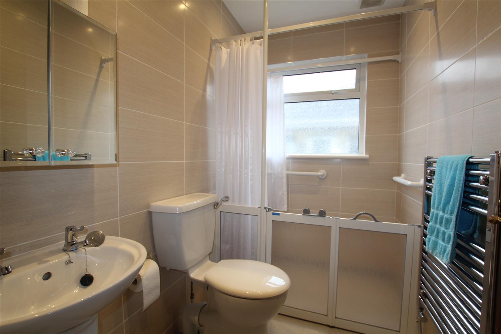 Matching suite of close-coupled wc, pedestal wash hand basin and walk-in shower. Tiled walls. uPVC obscured double-glazed window to side elevation. Chrome heated towel rail.