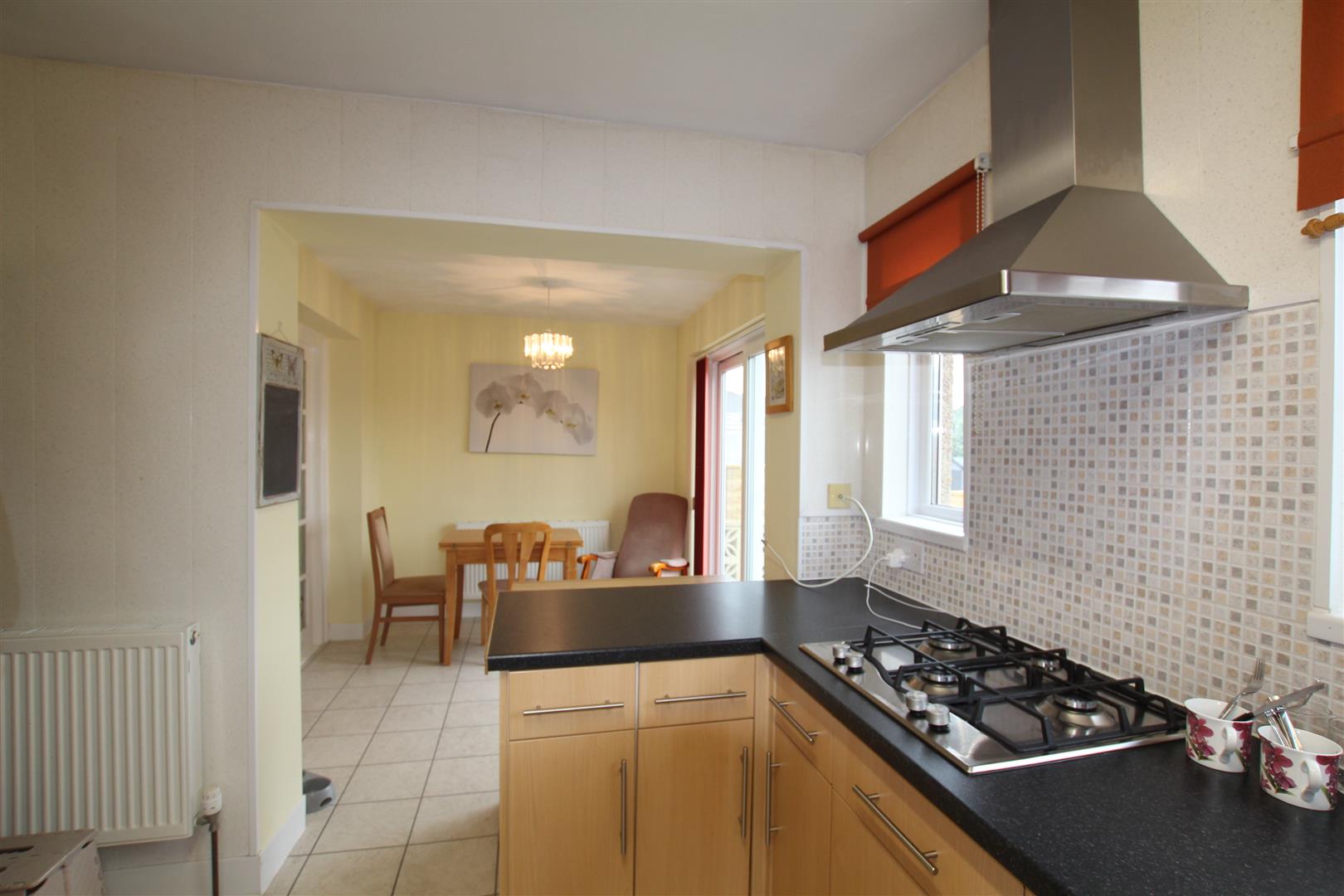 Matching base and wall-mounted units to include fitted twin oven and integral fridge-freezer. Space for washing machine and dishwasher. Roll-edge laminate work surface has inset one-and-half bowl stainless steel sink unit and gas hob. uPVC double-glazed windows to side and rear elevations. Square arch opening into the breakfast room.