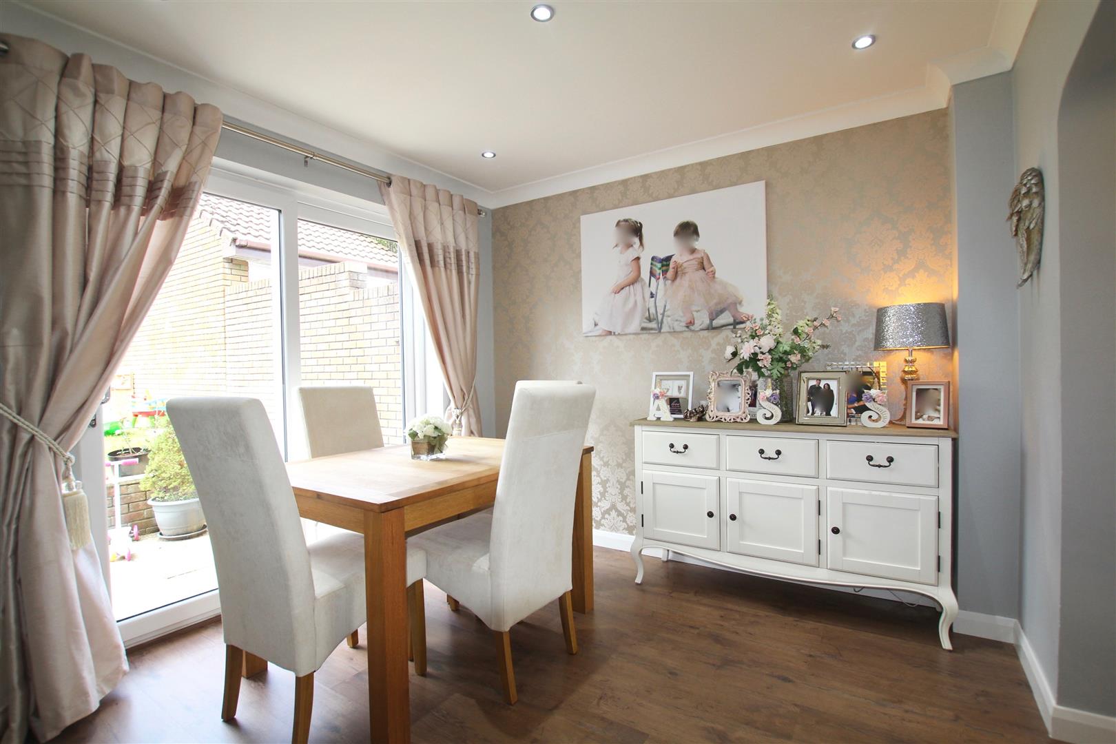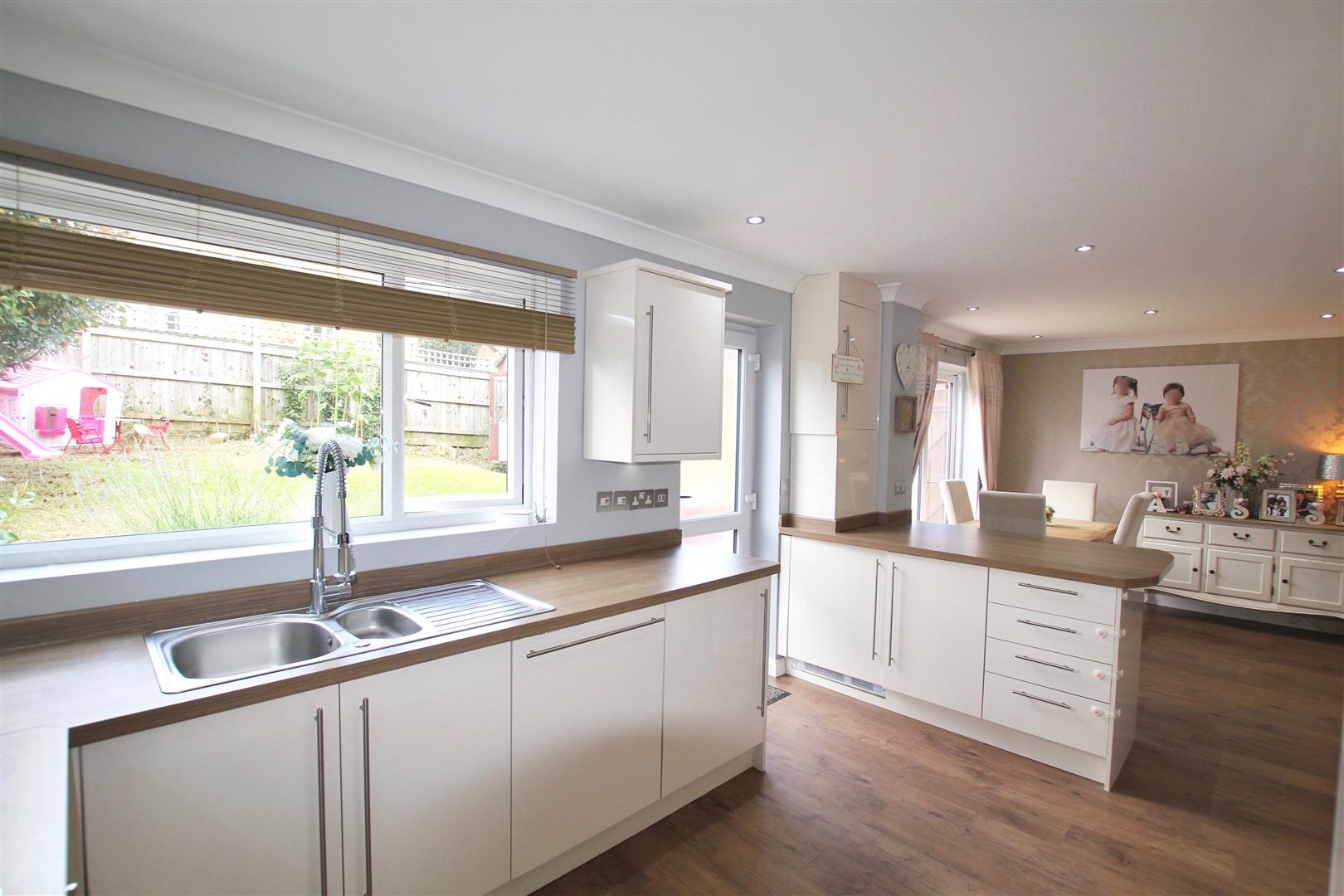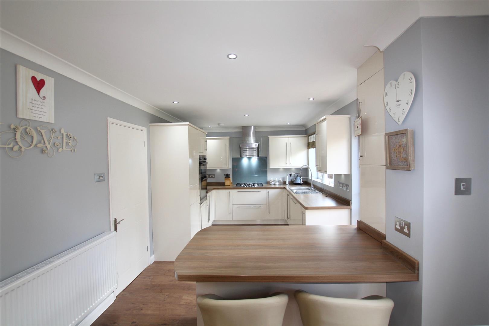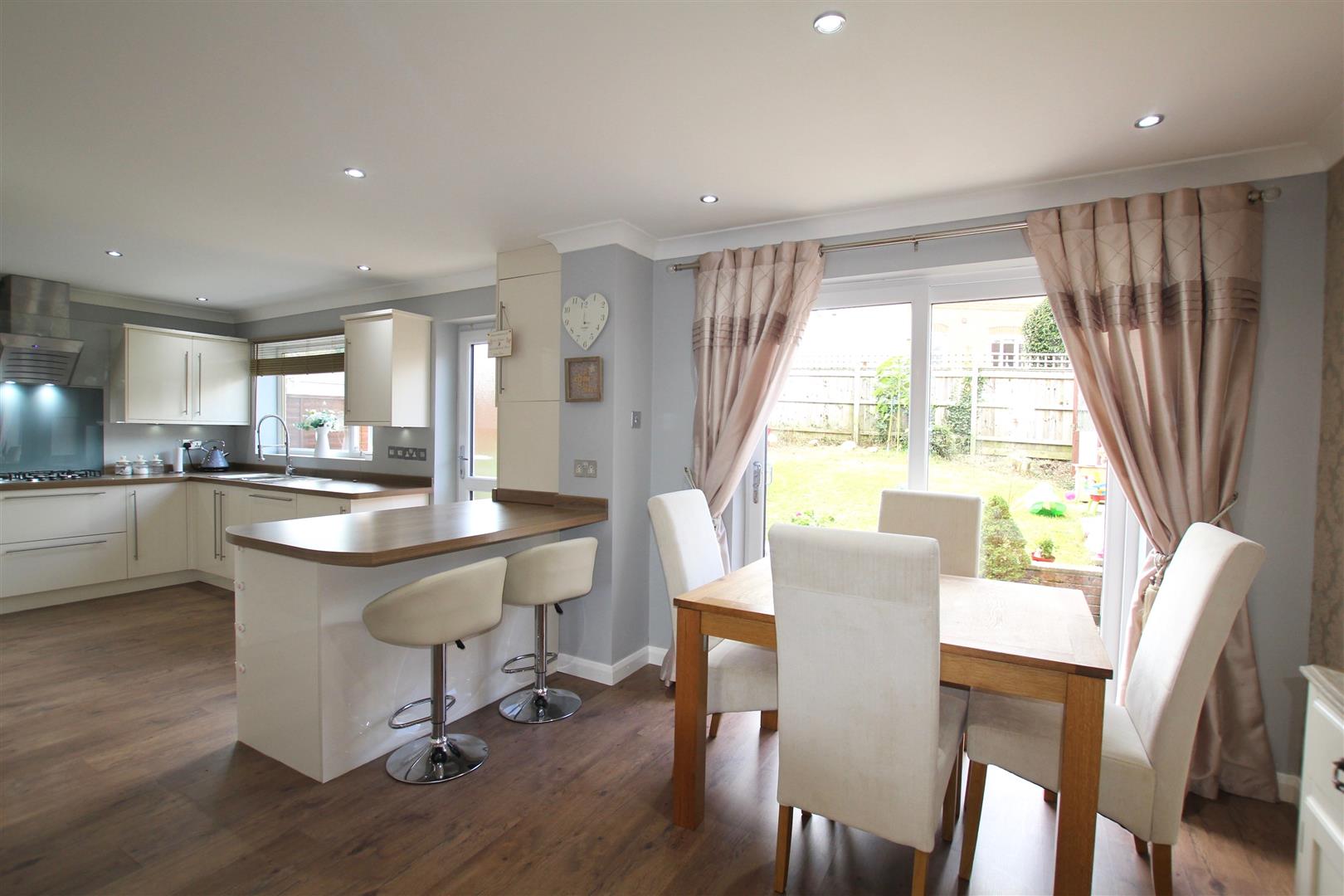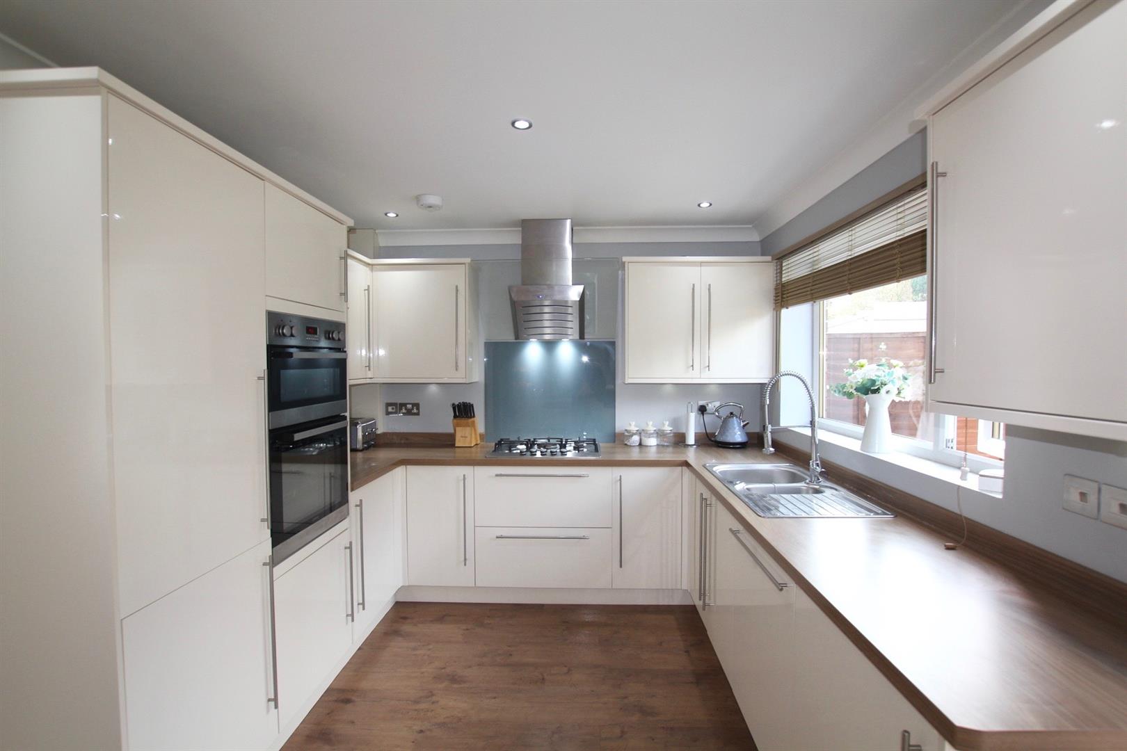 Matching high gloss base and wall-mounted units with under cupboard lighting to include integral twin oven, dishwasher, washing machine and also a tumble dryer. Square edge work surface has inset stainless steel five ring gas hob with contemporary filter hood over. One-and-half bowl stainless steel sink unit with spray tap. Breakfast bar. Spotlighting. uPVC double-glazed window to rear elevation. Wall-mounted boiler concealed in unit. uPVC obscured double-glazed door leading out to the rear garden. From the dining area is a further uPVC double-glazed sliding patio door leading out to the garden.
