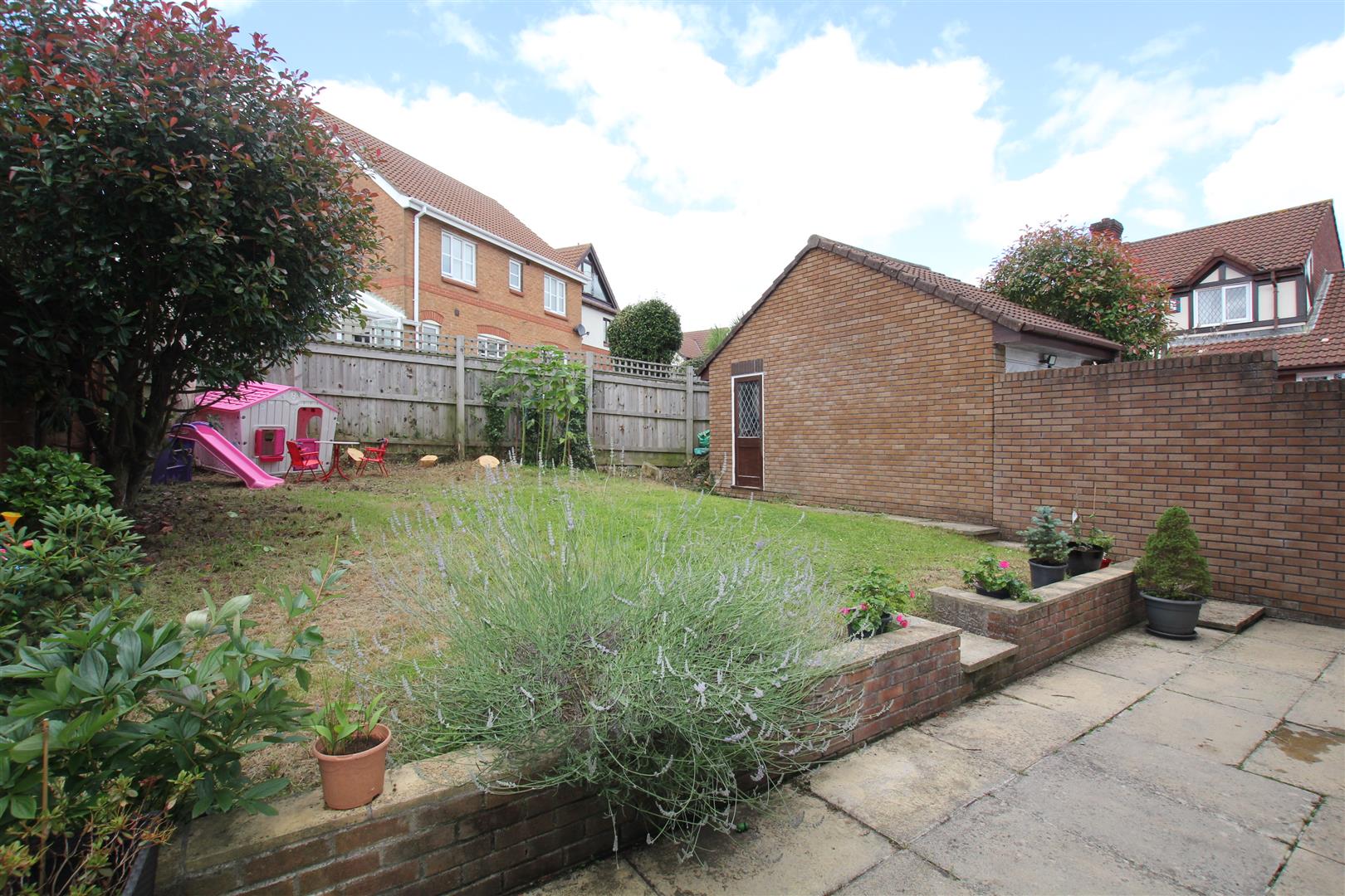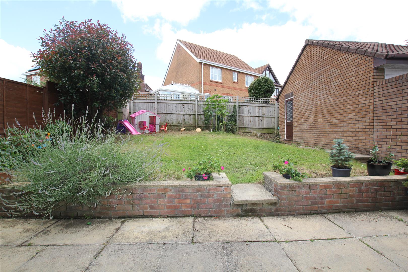 The property is approached via a paved path along side the property leading to the front door, this is bordered on one side which is the main section of garden laid to lawn with a couple of inset trees, shrubs and plants. To the rear is an enclosed garden which consists of a paved patio seating area. A courtesy gate leads out to the driveway to the fore of the garage where there is off-road parking for up to three cars. A couple of steps, one bisecting the middle and one to the side lead up to the main section of garden which is laid to lawn with a paved path running along one side up to the the courtesy door opening into the garage. The boundaries are wood panel fencing and brick.