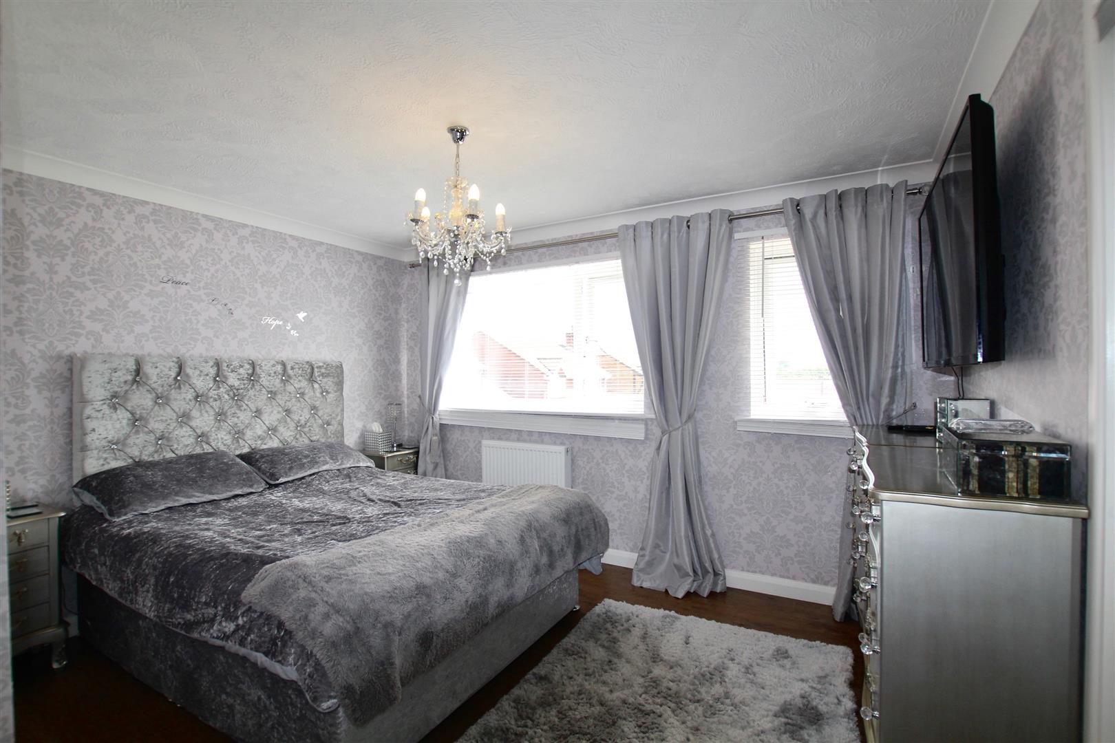 Fitted wardrobes along one wall with mirrored doors with shelving and hanging rail. Laminate wood flooring. Two uPVC double-glazed windows to front elevation. Door opening into the en-suite.