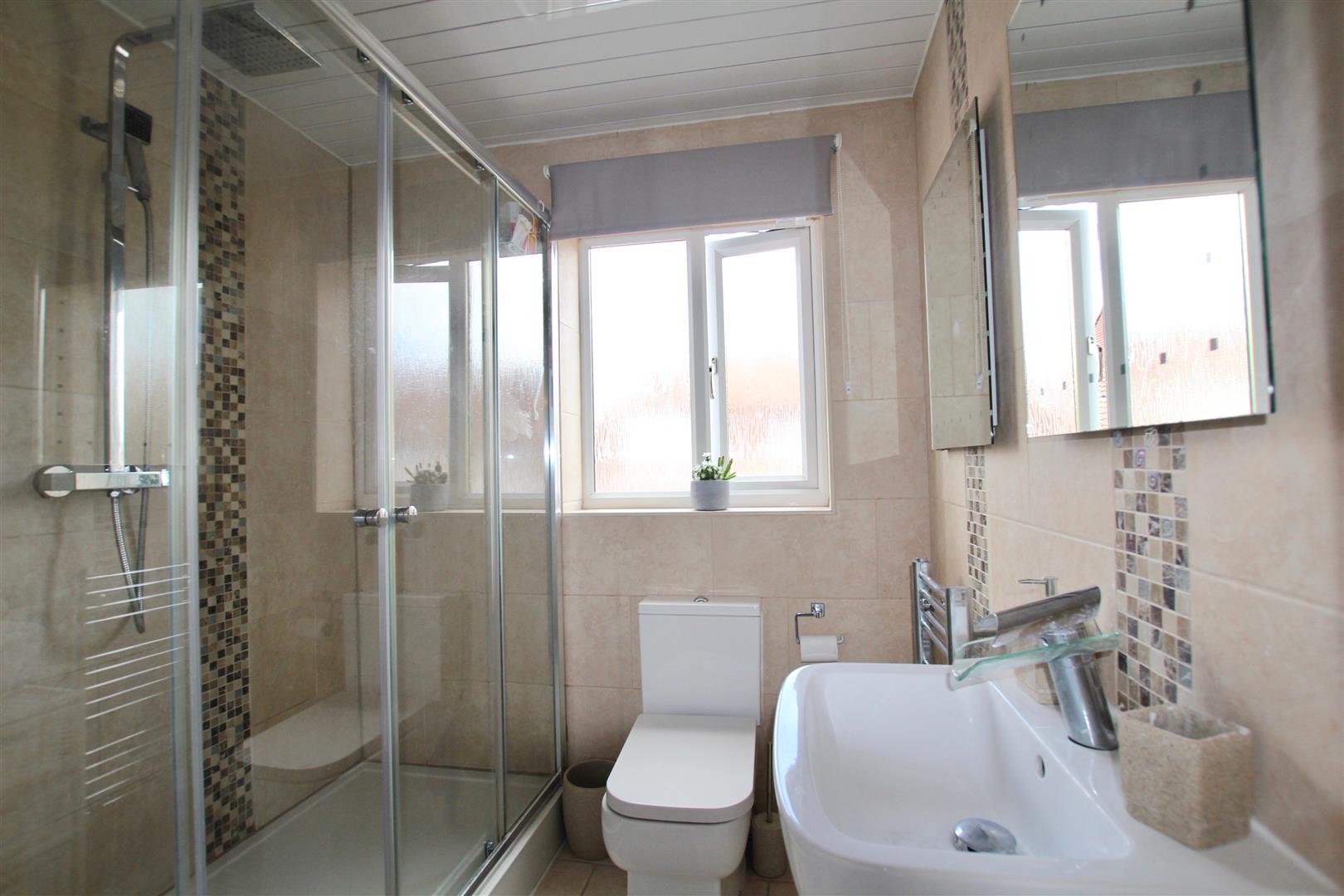 Attractive matching suite of contemporary close-coupled wc, pedestal wash hand basin with glazed waterfall tap and twin shower cubicle with twin shower heads. Chrome heated towel rail. Ceramic tiled floor. Tiled walls. Obscured double-glazed window to side elevation.