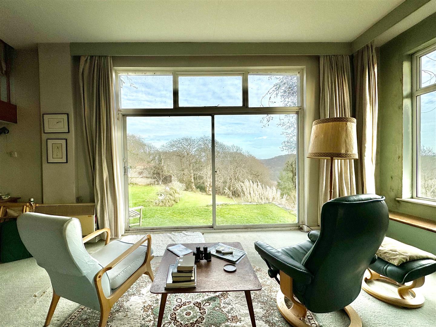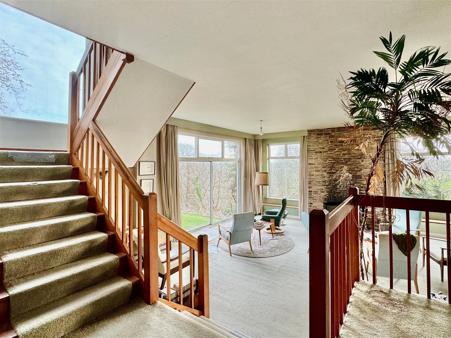 A beautiful open-plan split-level room with high ceilings. The room is dual aspect with windows and sliding patio doors providing fabulous views over Fox Cove valley towards the Yealm. Tavistock stone-built chimney breast with open fireplace and window seats either side with storage beneath. Concealed storage. Recessed floor to ceiling bookcase. Wooden staircase, believed to be Panama Pine from South America, with balustrade ascending to the first floor. Built-in plant trough beneath the stairs. Larder.