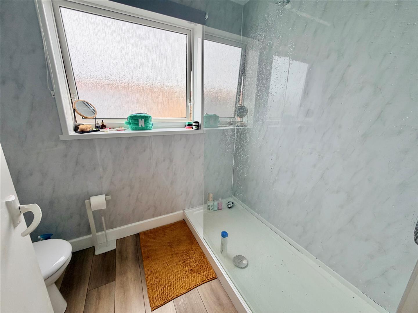Comprising a large walk-in shower with a fixed glass screen, wc and basin. Chrome towel rail/radiator. Waterproof panelling to the walls. Obscured window to the side elevation.
