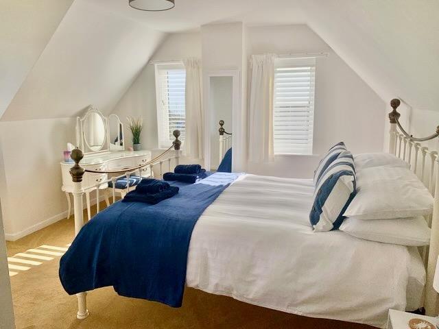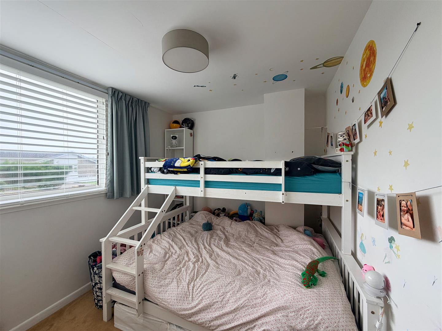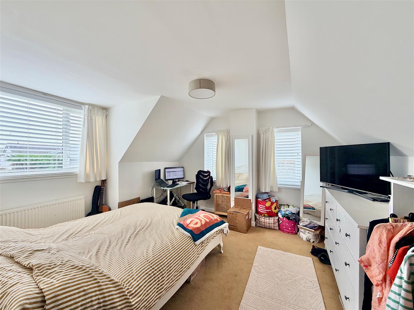 A dual aspect room with windows with fitted blinds to the front and side elevations. There are views towards the sea from the side elevation. Eaves storage access.