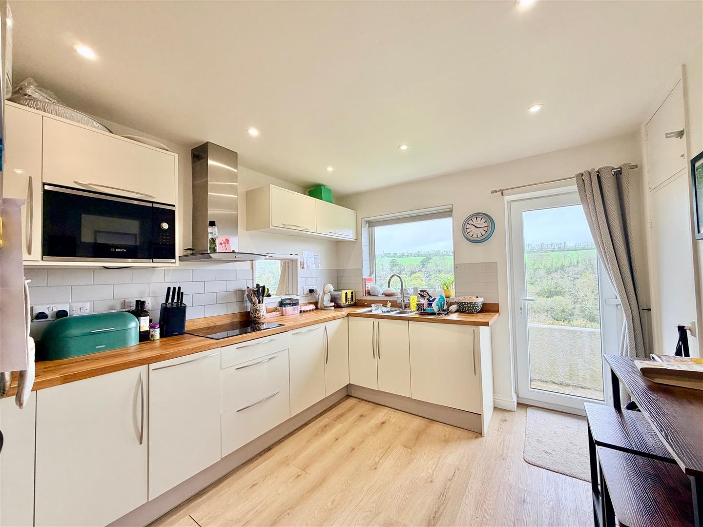 Range of base and wall-mounted kitchen cabinets with hard wood work surfaces. Stainless-steel one-&-a-half bowl single drainer sink unit. Built-in Bosch microwave. Built-in oven. Separate Bosch hob with a cooker hood above. Space for free-standing fridge-freezer. Integral washing machine. Integral slimline dishwasher. Pull-out bin store. Recessed pantry-style cupboard with shelving. Window to the rear elevation with views. Glazed door leading to outside.