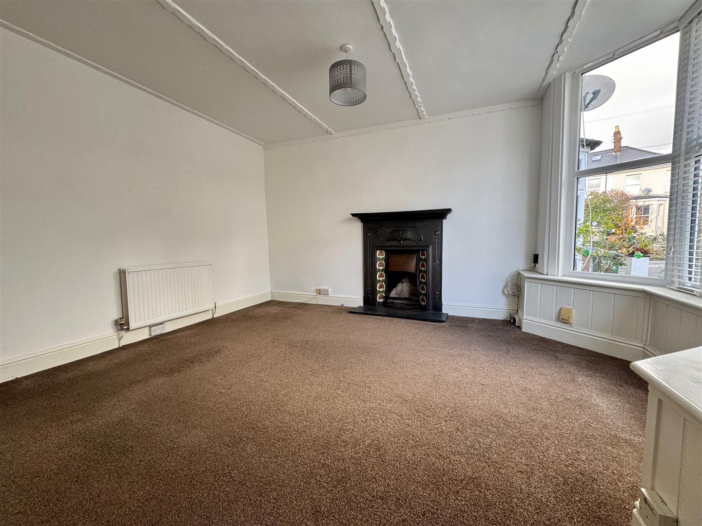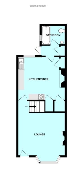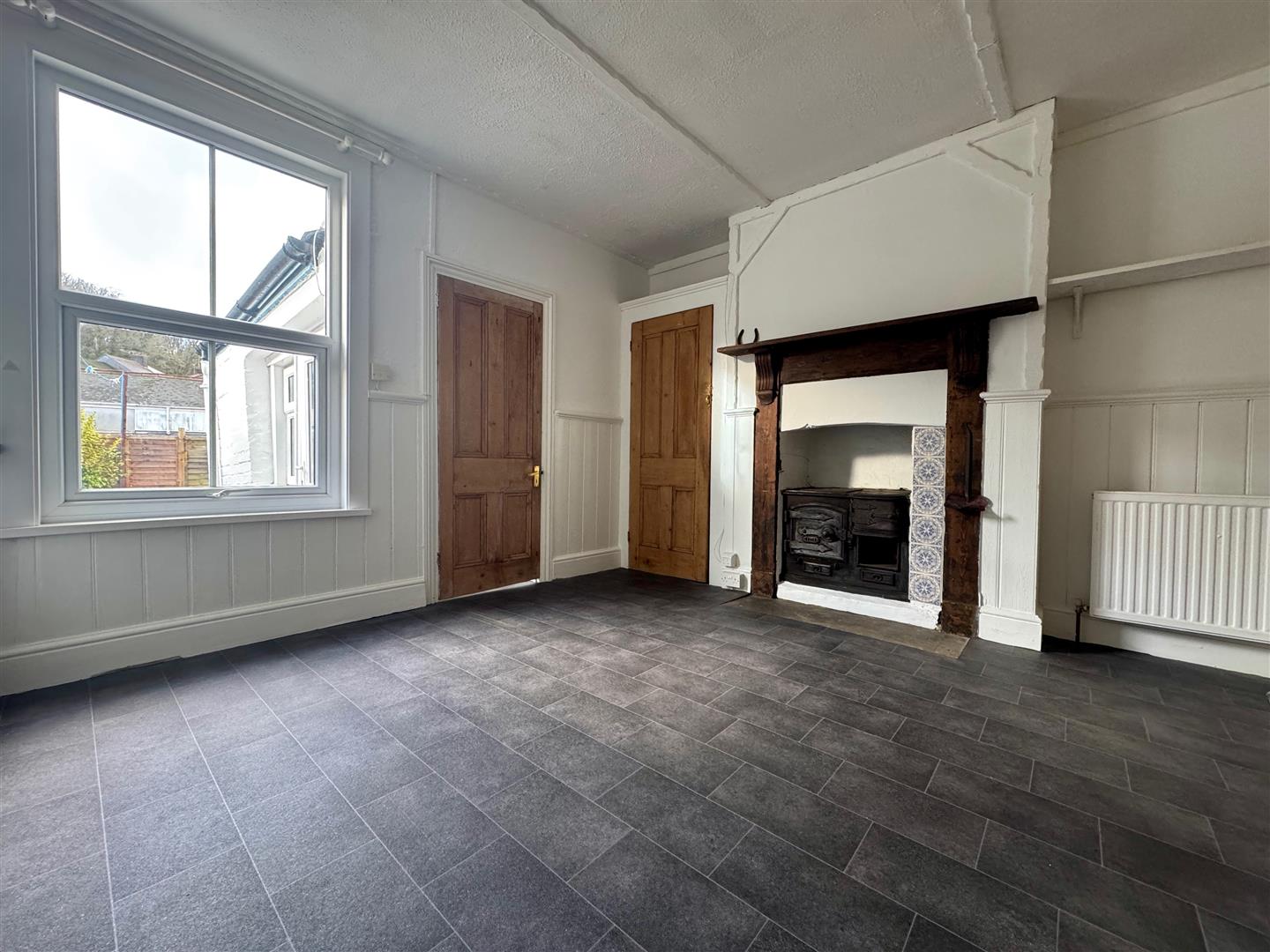 Feature fireplace with a cast iron mantle & surround, decorative tiled inset & slate hearth. uPVC double-glazed bay window to the front. Staircase rising to the first floor landing. A wooden door with glazed panels opens into the kitchen/diner.