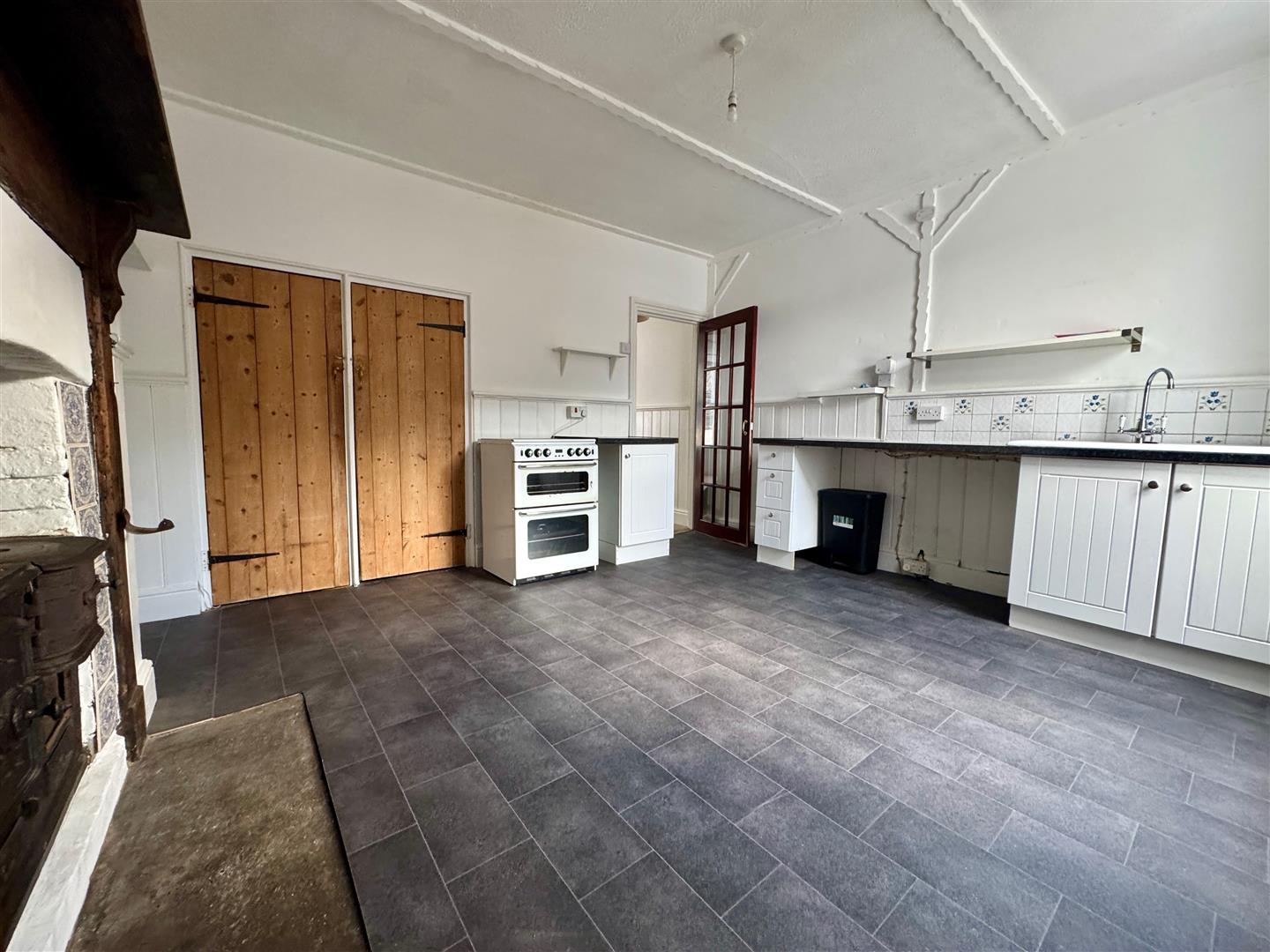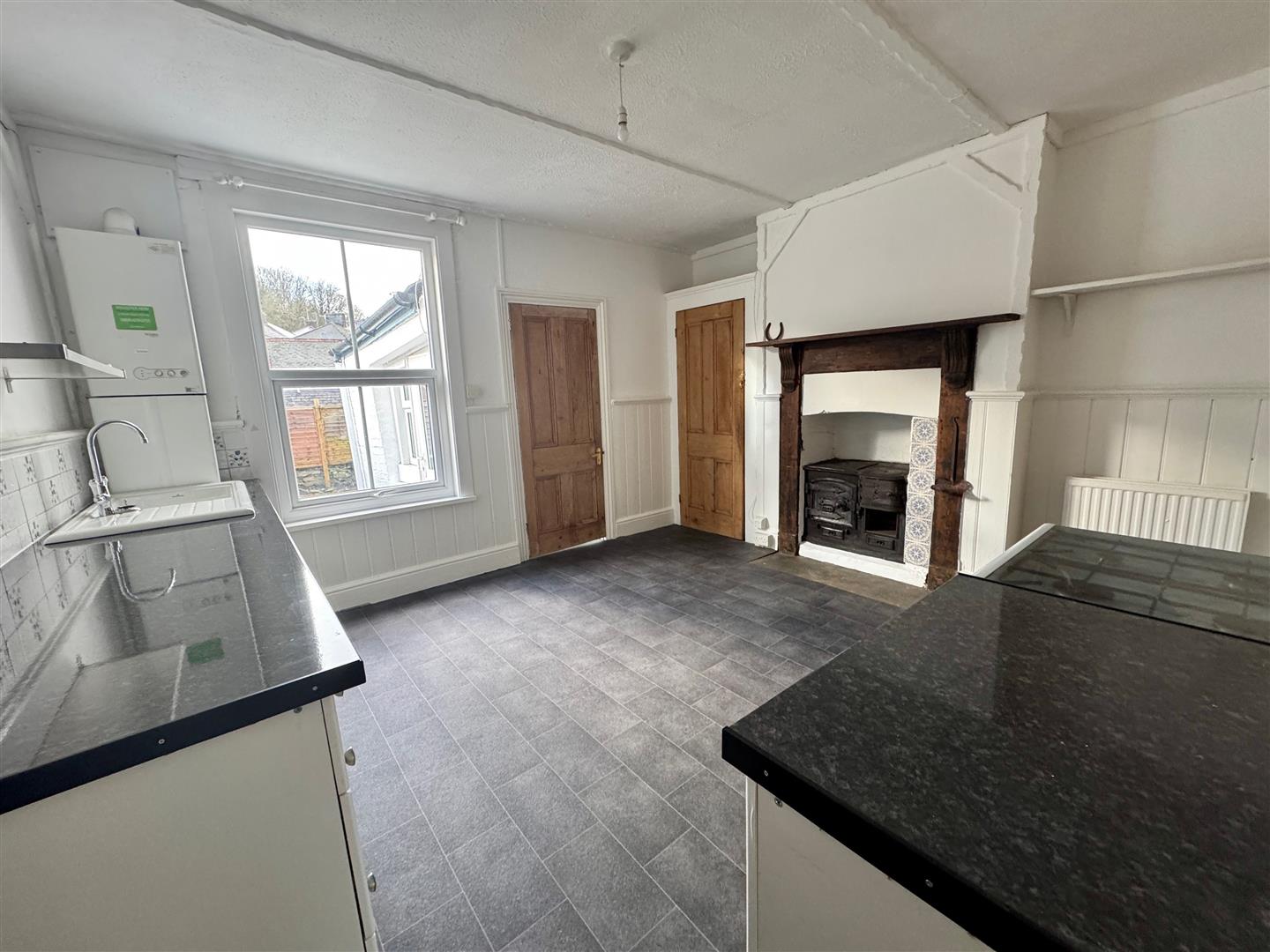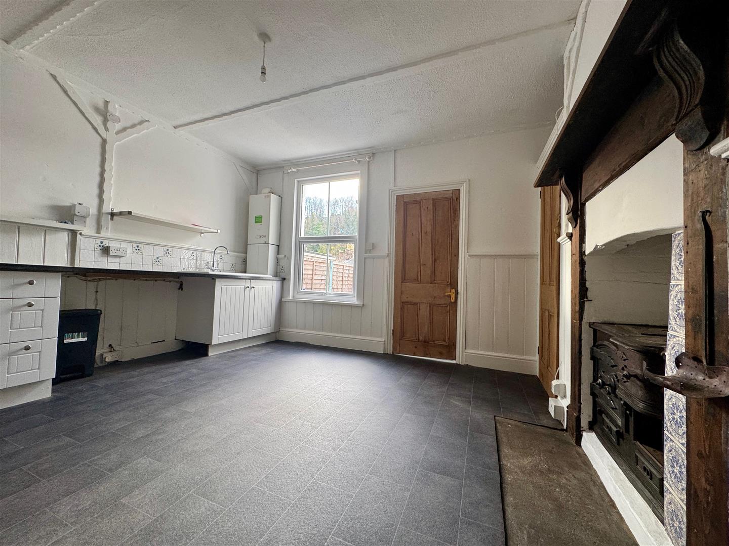 Matching base units with roll edge laminate work surface. Space for a cooker, washing machine & fridge. Ceramic sink unit with mixer tap. Tiled splash-back. Wall mounted Vokera combination boiler. uPVC double-glazed window to the rear. Tiled effect vinyl flooring. Doors to twin storage cupboards. Further shelved storage cupboard. Feature fireplace with wood mantle & surround, with inset decorative tiles & old original cast iron stove (not operational). Door opens to the inner hallway.