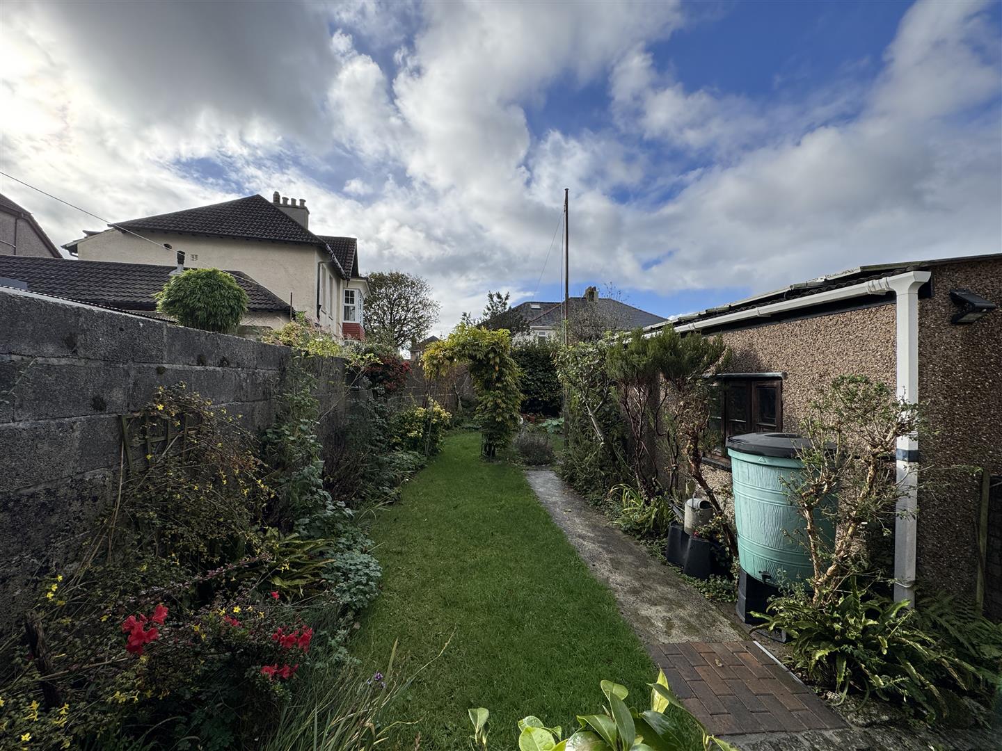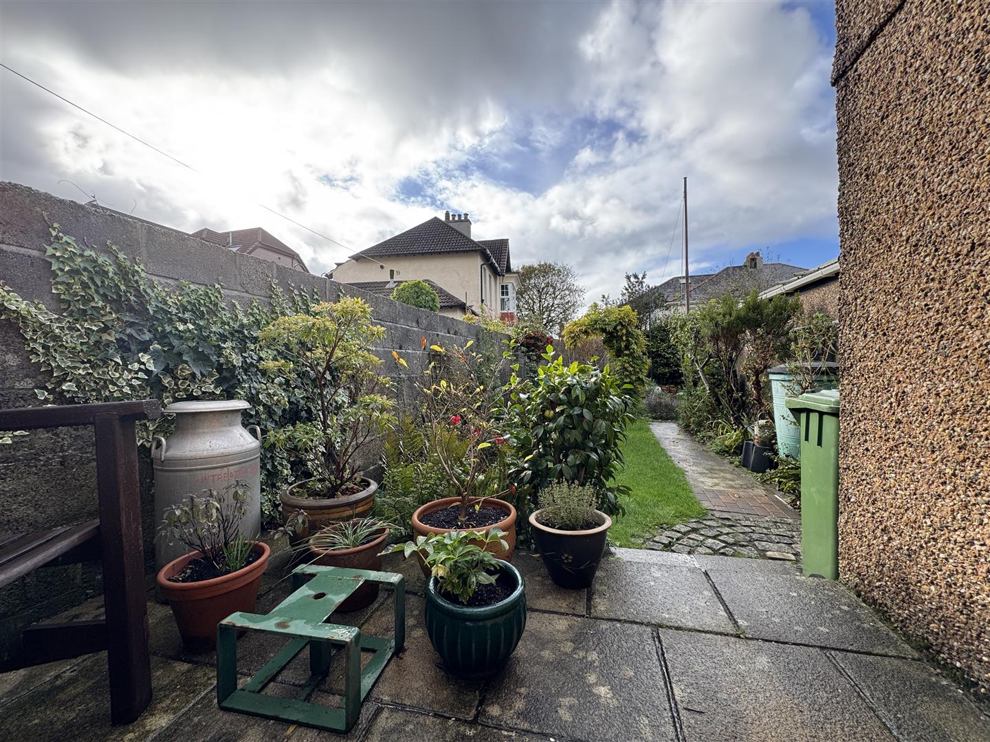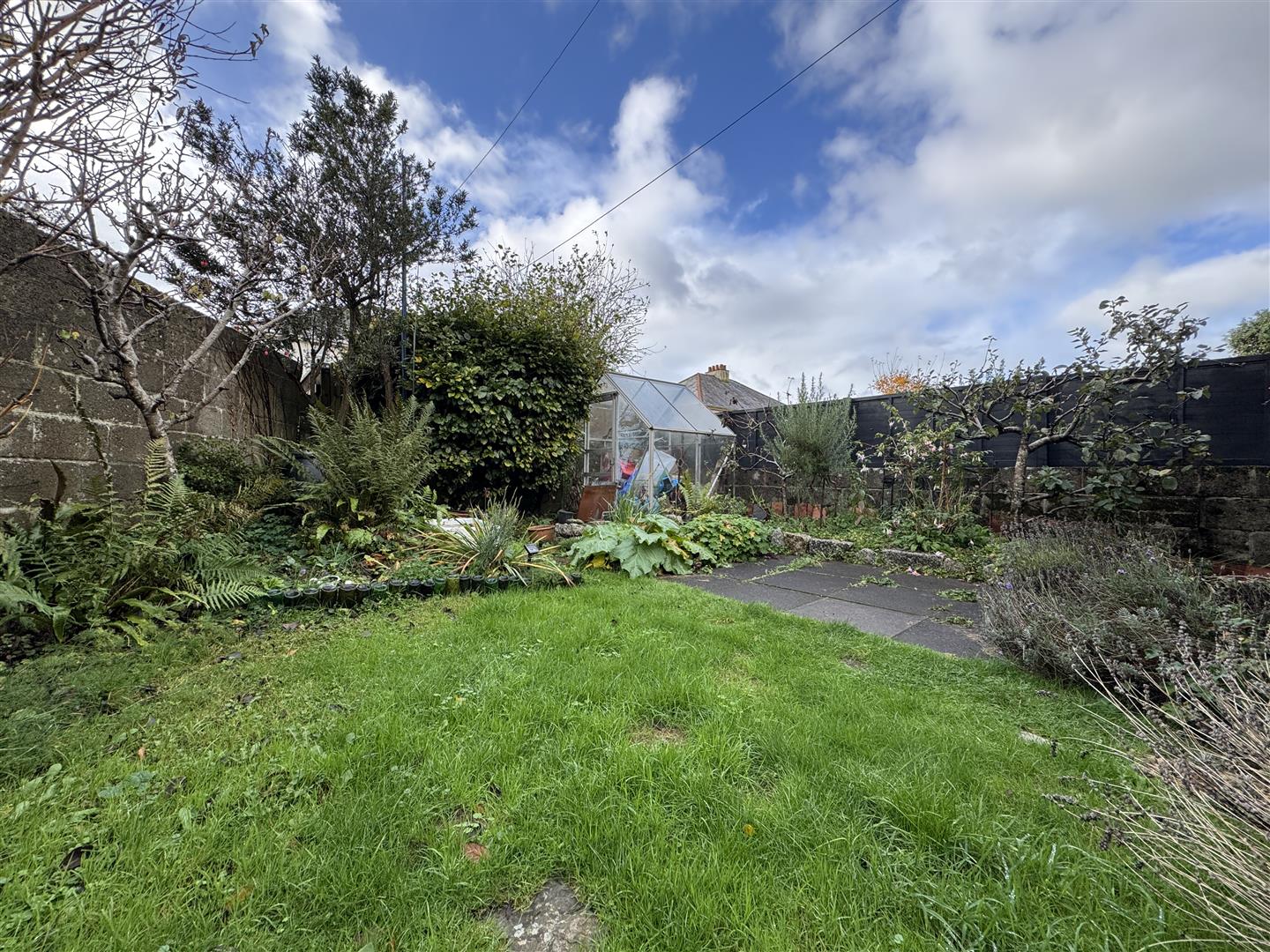 A wooden picket gate opens to the enclosed south-facing rear garden with paved patio. A path bisects down through the garden with lawn to one side with raised flower beds & further shrubs to the other side. A patio stands to the rear of the property. Greenhouse. Boundaries are walled & wood panel fencing.