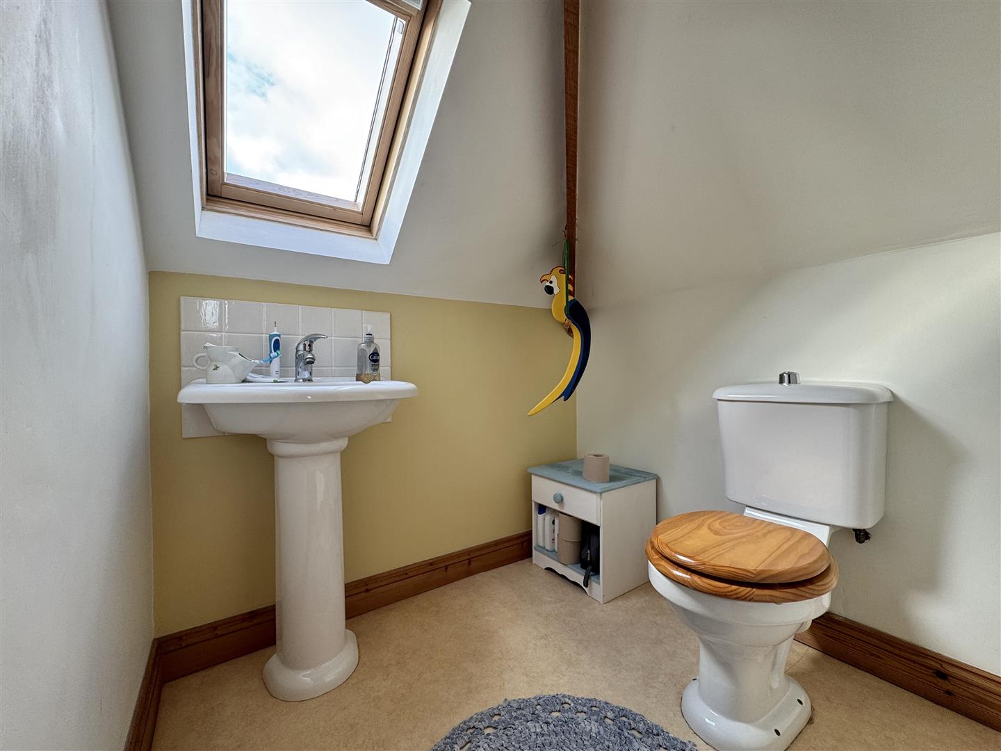 Close coupled wc & pedestal wash hand basin. Tiled splash-back. Restricted head height. Velux window to the rear.