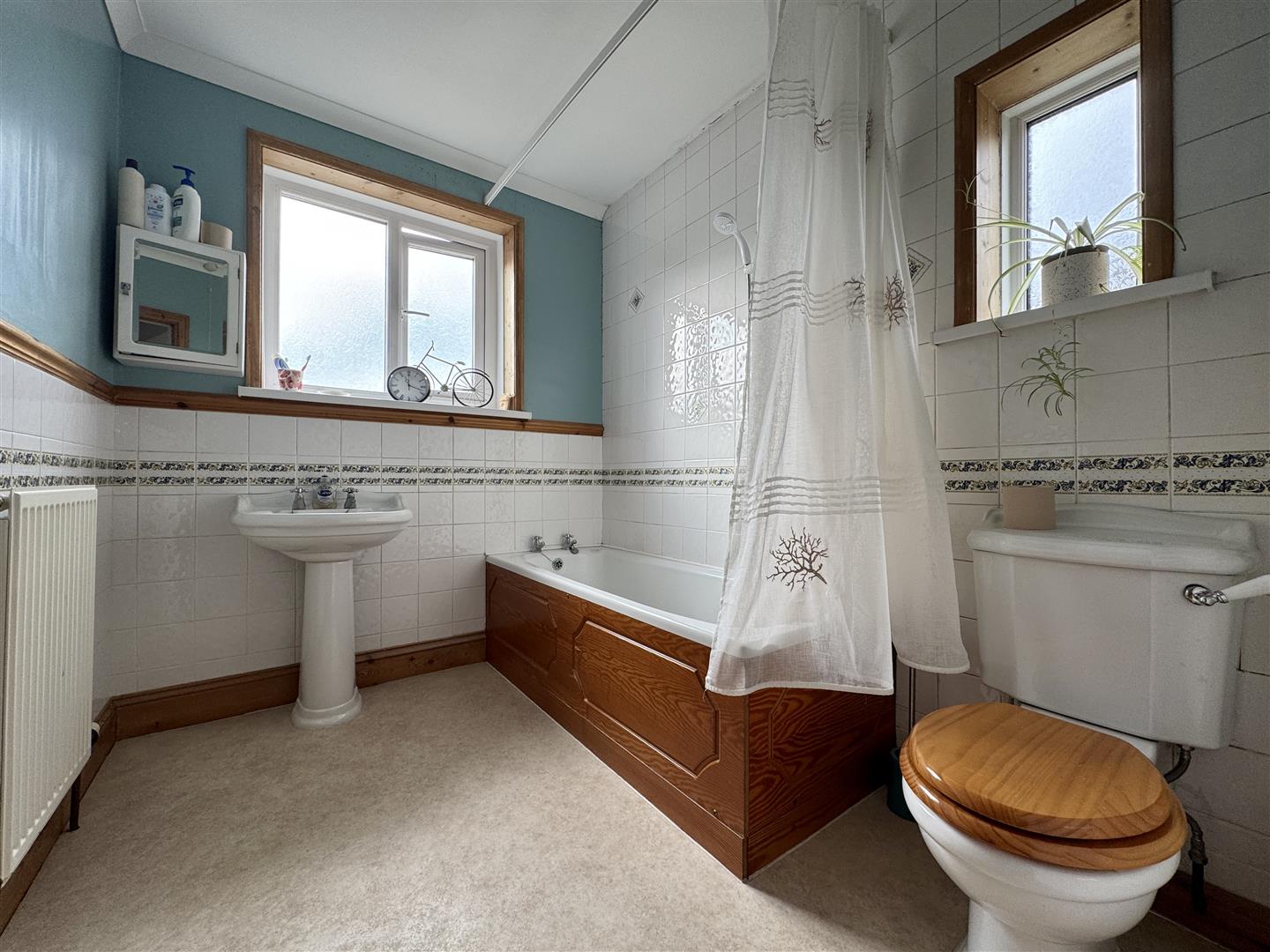 Matching suite of panelled bath with electric Mira shower over, close coupled wc & pedestal wash hand basin. Part-tiled walls. Dual aspect with obscured uPVC double-glazed window to the rear & side. Vinyl flooring. Access hatch to roof void.