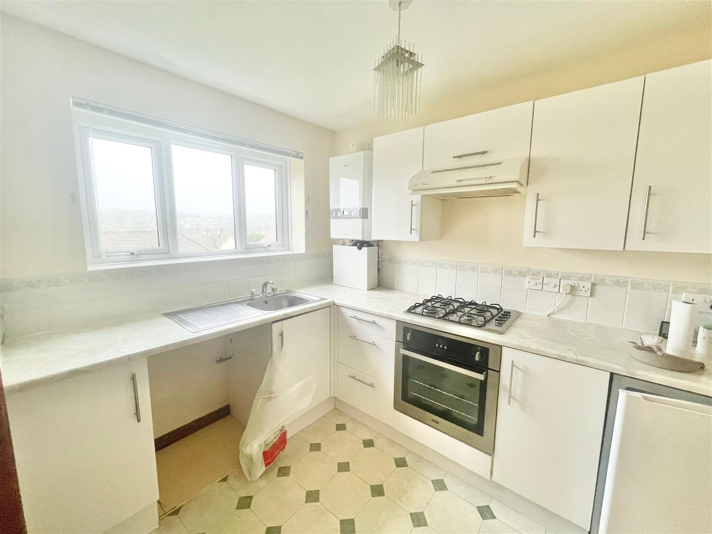 Fitted with a range of matching eye-level and base units with roll-edged work surfaces and tiled splash-backs. Inset single-drainer sink unit with mixer tap. Built-in 4-ring gas hob with electric oven beneath. Wall-mounted gas boiler. Washing machine and fridge in situ which may be included within the tenancy if desired. Double-glazed window to the rear. Built-in larder cupboard.
