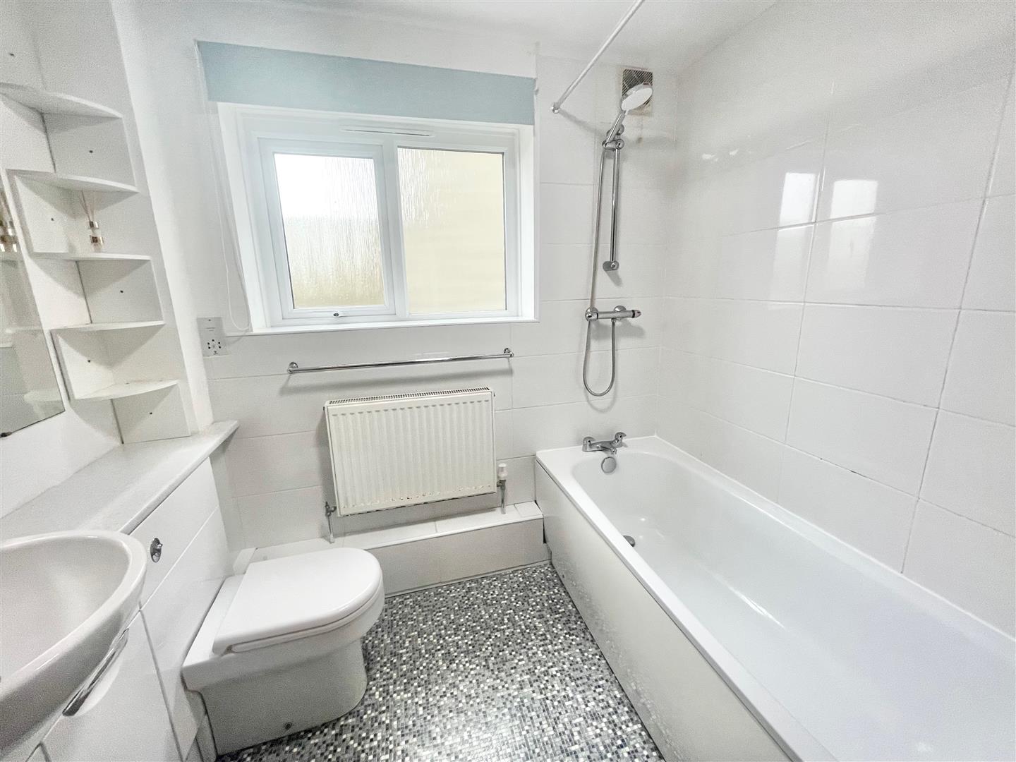 Fitted with a white modern suite comprising panel bath with mixer tap, shower unit and spray attachment above, sink unit with vanity cupboard beneath and low-level toilet with boxed-in cistern. Obscured double-glazed window to the side. Radiator. Built-in linen cupboard.