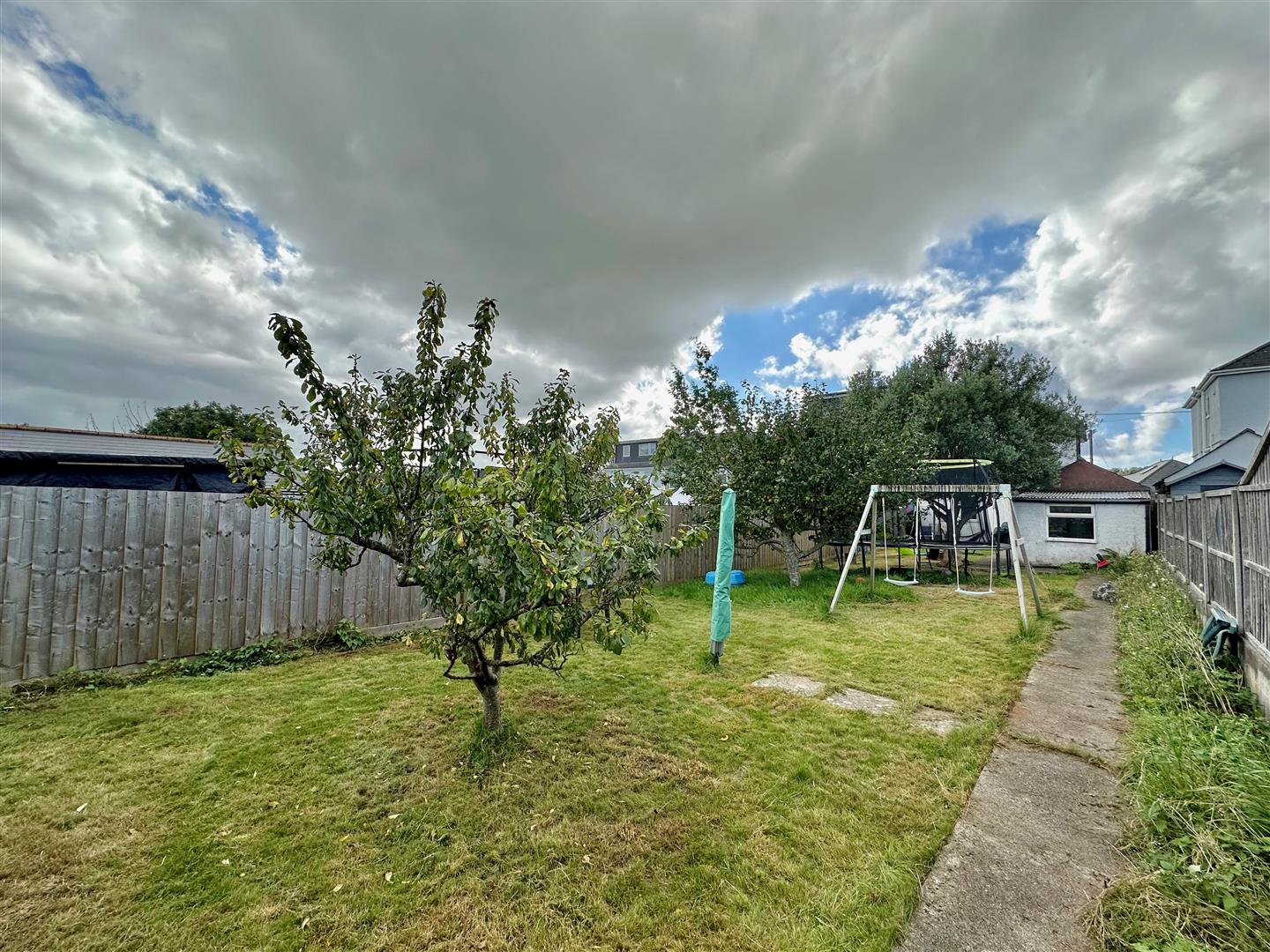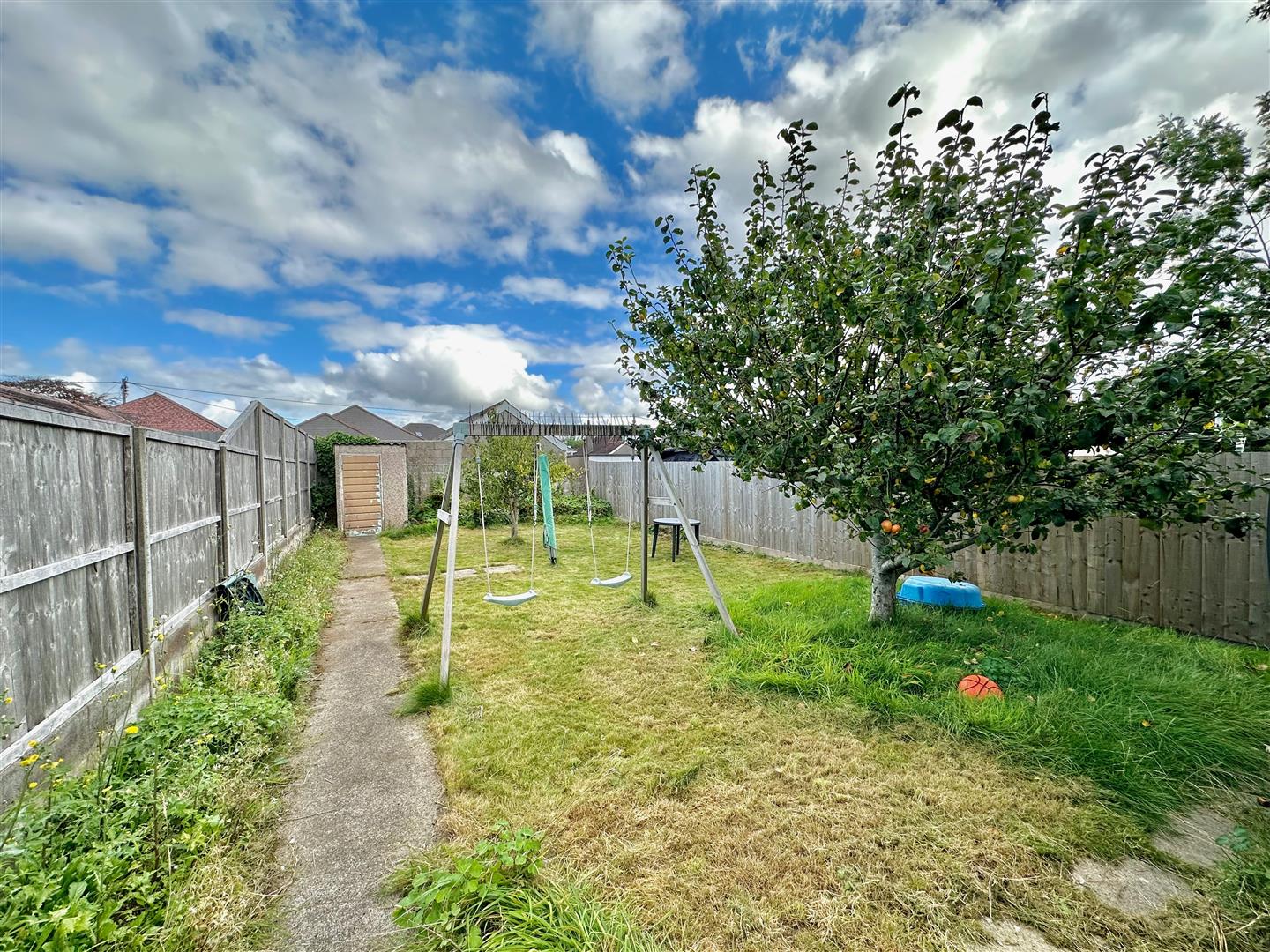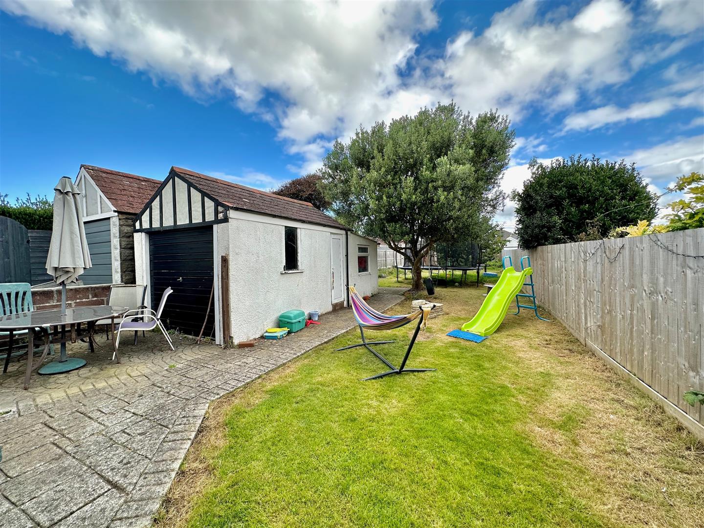 A driveway provides access and off-road parking. The drive continues alongside the house leading to the garage. The front garden is laid to slate chippings together with a shrub and flower bed. The rear garden is mainly laid to lawn. There is a patio area laid adjacent to the property and a pathway leads alongside the garage and continues to the end of the garden where there is a small shed and a plum and apple tree.