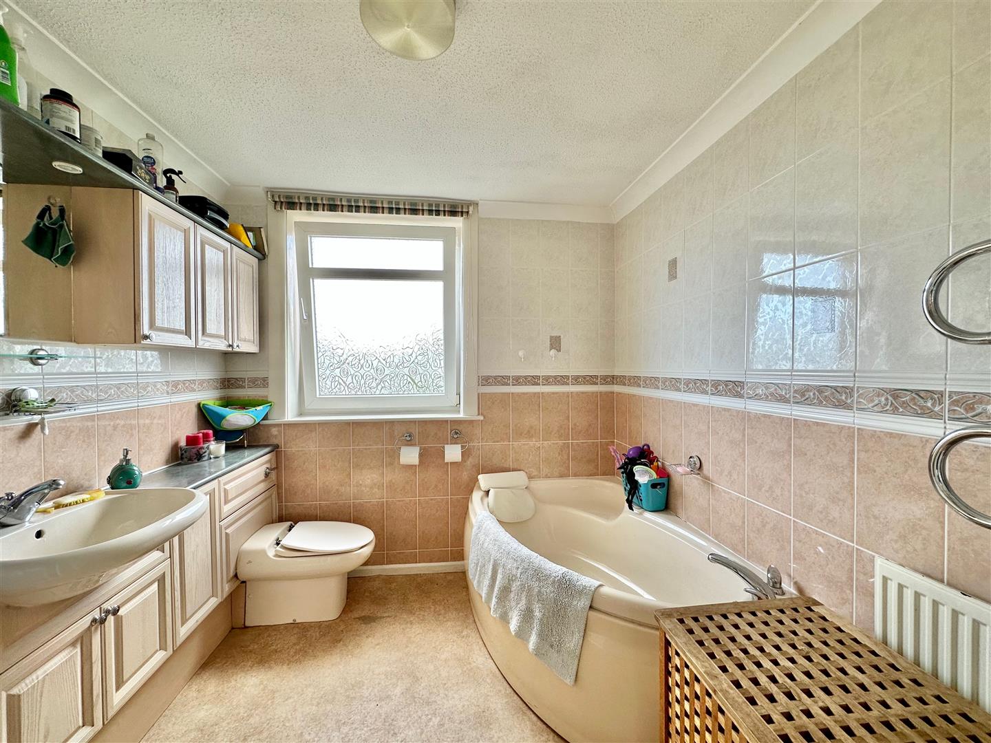 Comprising a corner-style bath, separate shower with a Mira Sport shower system, basin with storage cabinet beneath and wc with a concealed cistern. Matching wall-mounted cupboards above. Chrome wall-mounted heated towel rail. Radiator. Mirror and lighting. Fully-tiled walls. Obscured window to the rear elevation.