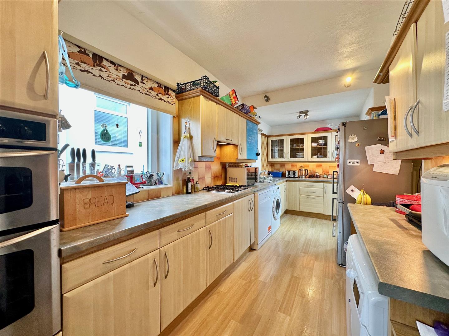Range of base and wall-mounted cabinets with matching fascias, work surfaces and tiled splash-backs. Stainless-steel single drainer sink unit. 4-burner gas hob with a cooker hood above. Built-in double oven and grill. Space for washing machine and dishwasher. Additional work surface with space for further 2 free-standing appliances with a matching wall-mounted cupboard above. 2 windows to the side elevation. Doorway leading to outside.