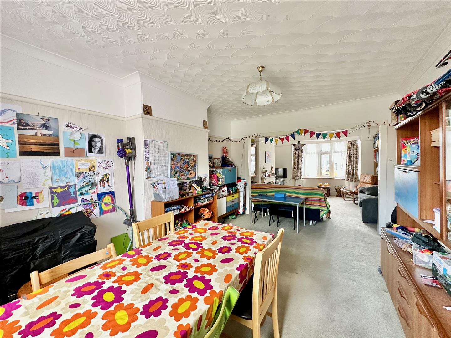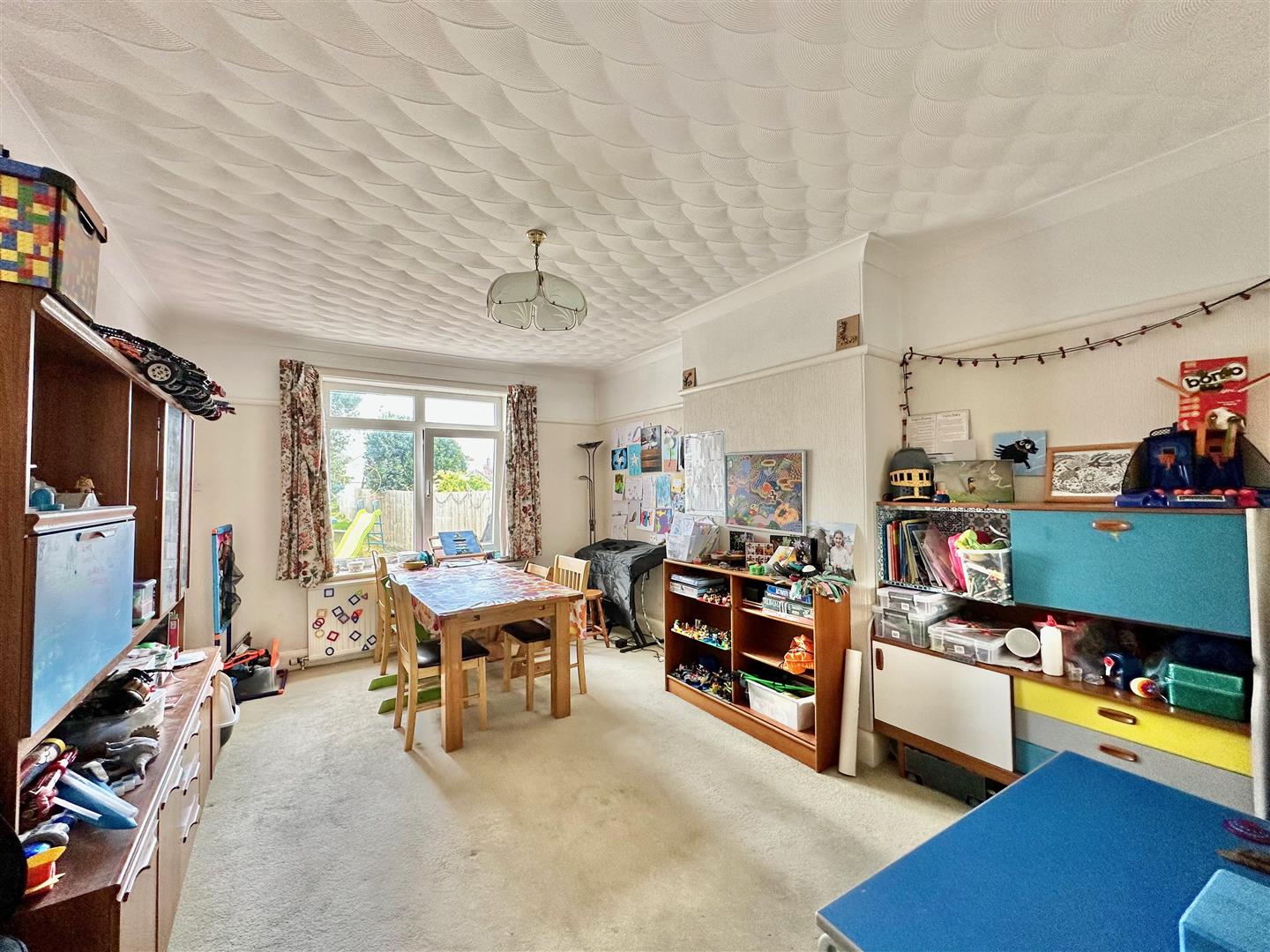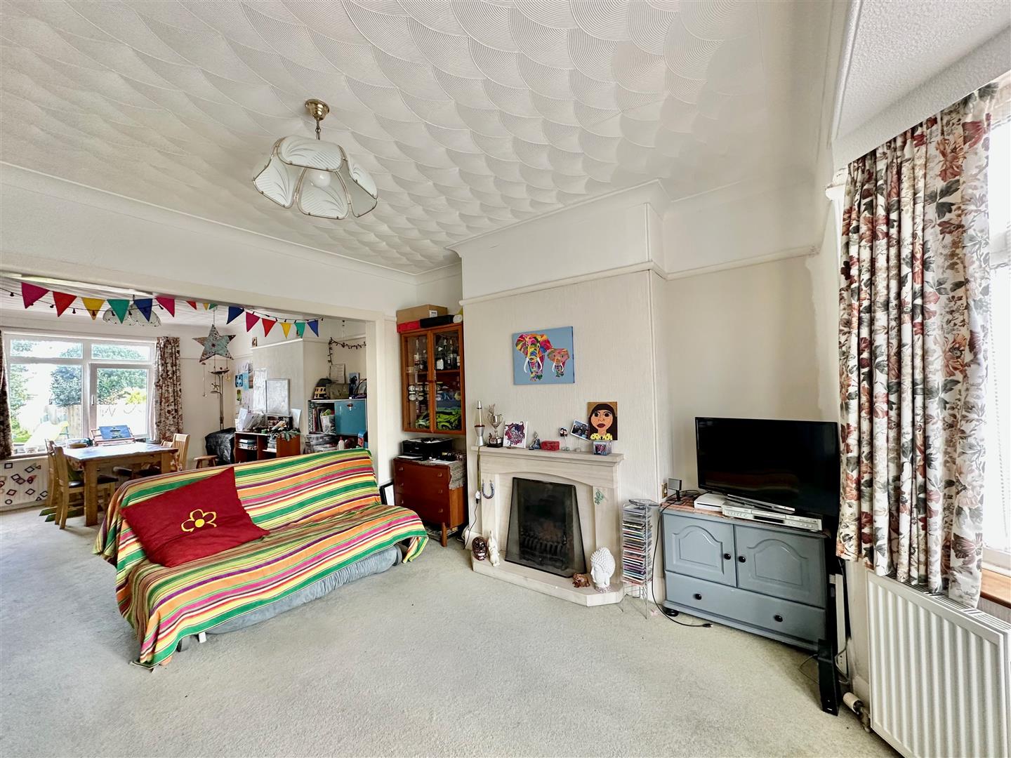Bay window to the front elevation. Chimney breast with gas fireplace. Open-plan access through into the dining room. The dining area has ample space for dining table and chairs. Window to the rear elevation overlooking the garden. Doorway opening into the kitchen.