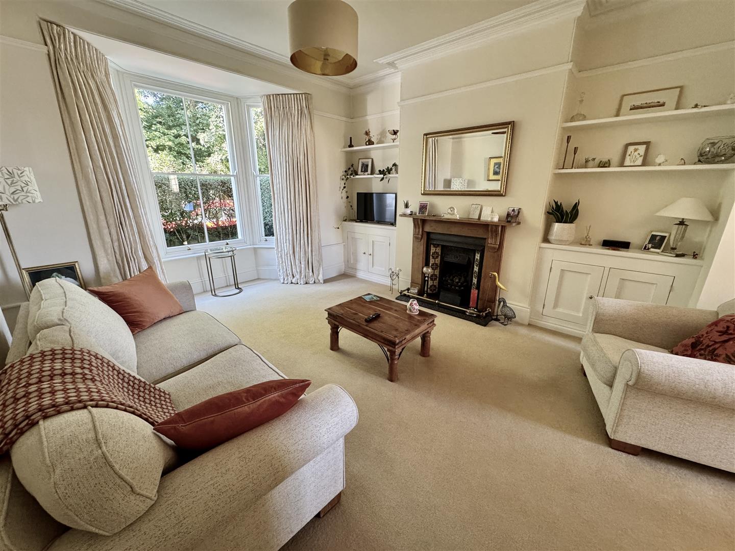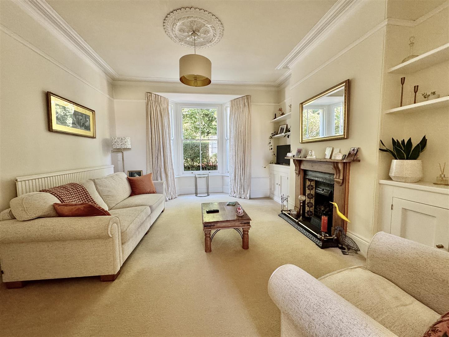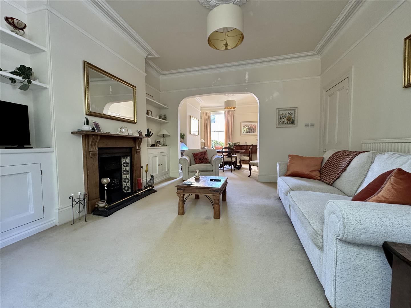 Feature fireplace with wood mantle & surround with cast iron inset & living flame gas fire which is not functional. Sash-style bay windows to the front. Covings. Ceiling rose. Picture rail. Fitted storage units to both chimney breast recesses. Curved arch opens into the dining room.