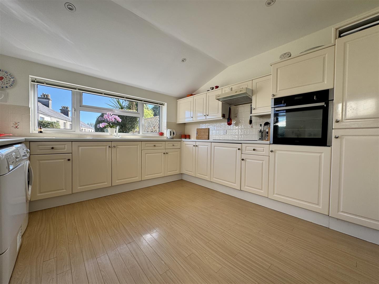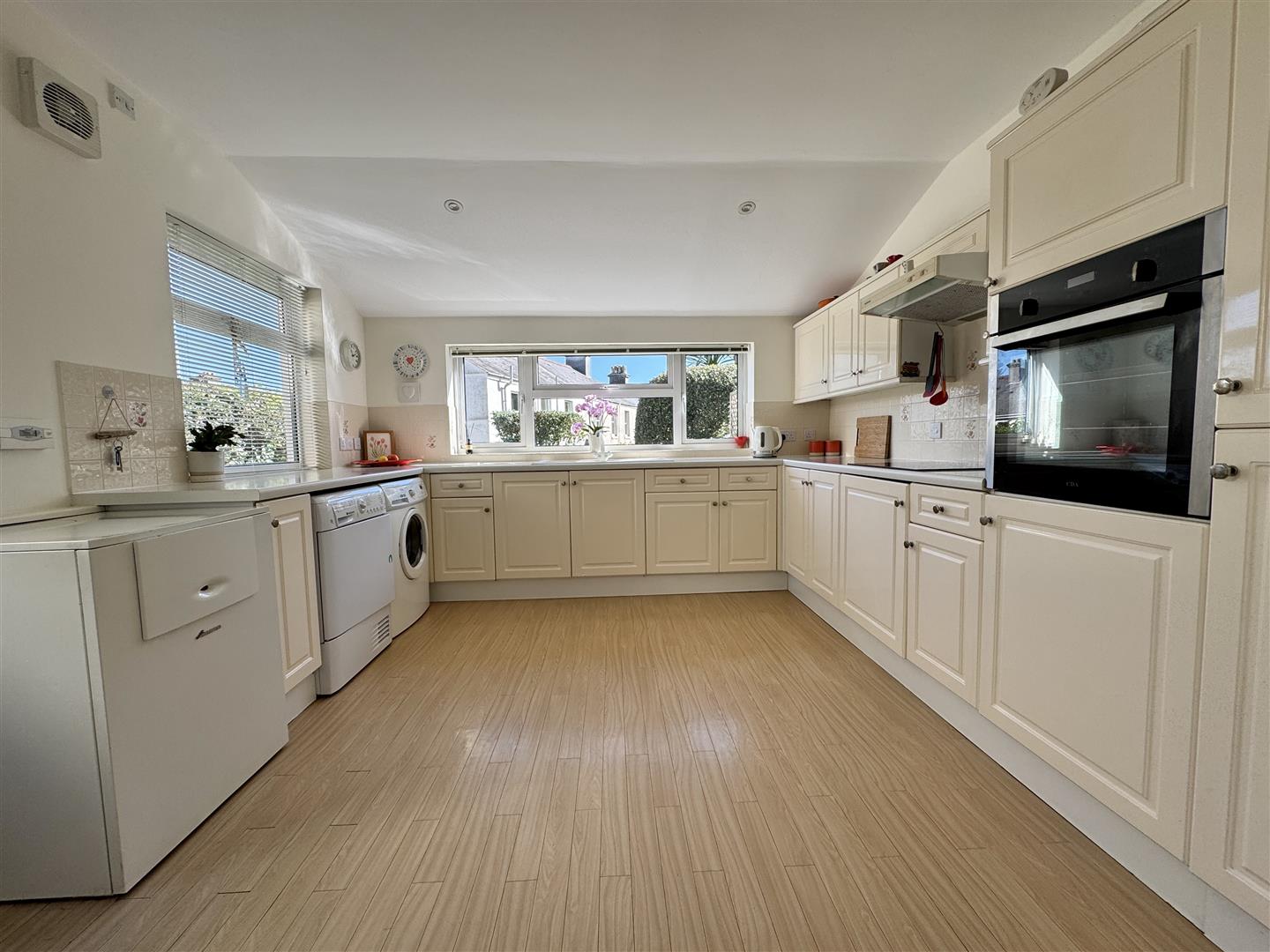 Light & airy kitchen with matching base & wall mounted units with fitted oven. Space for a washing machine & tumble dryer. Roll edge laminate surfaces have inset 1.5 bowl sink unit with mixer tap & 4 ring ceramic hob with filter hood over. Tiled splash-back. Floor standing Worcester boiler. Extractor fan. Dual aspect with uPVC double-glazed window to the rear overlooking the garden on one side. uPVC obscured double-glazed door which opens to the side & rear garden.