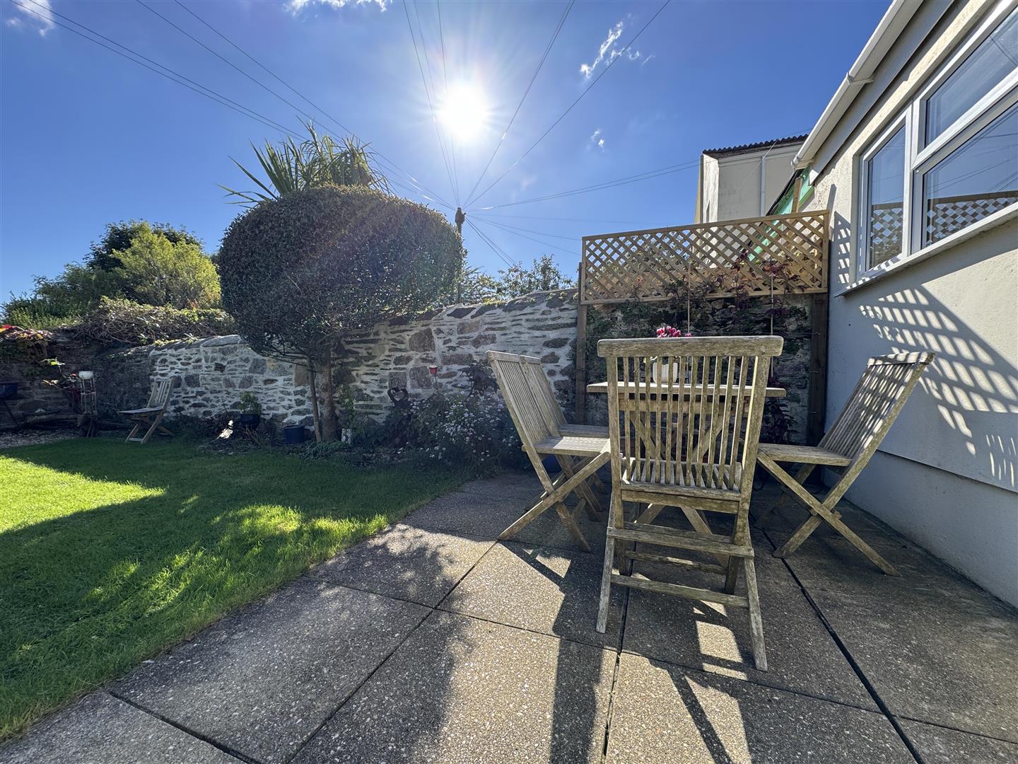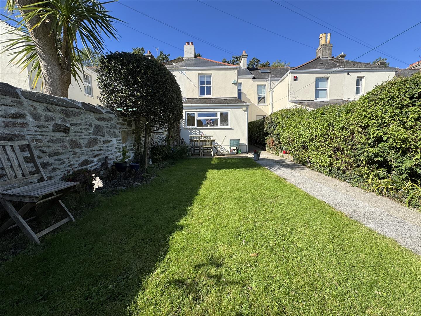 To the rear an enclosed garden with a raised paved patio seating area which overlooks the main section of garden laid to lawn. A paved path running along one side down to a wooden gate, which gives access out to the service lane. A stone chipped area stands towards the rear boundary, which provides a nice seating area. The boundaries are hedging & stone walls.