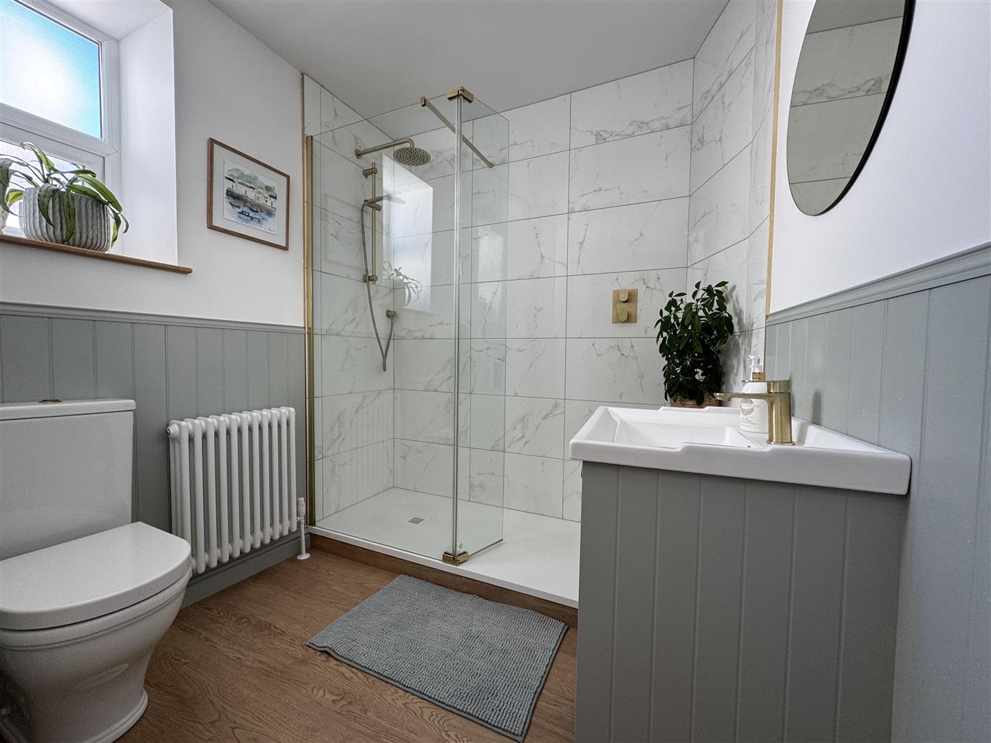 Attractive matching suite of walk-in shower with dual shower-heads both rainfall & handheld, close coupled wc & wash hand basin inset into vanity storage cupboards below. Part-tiled walls. Part wood cladding to dado height. Obscured uPVC double-glazed window to the side.