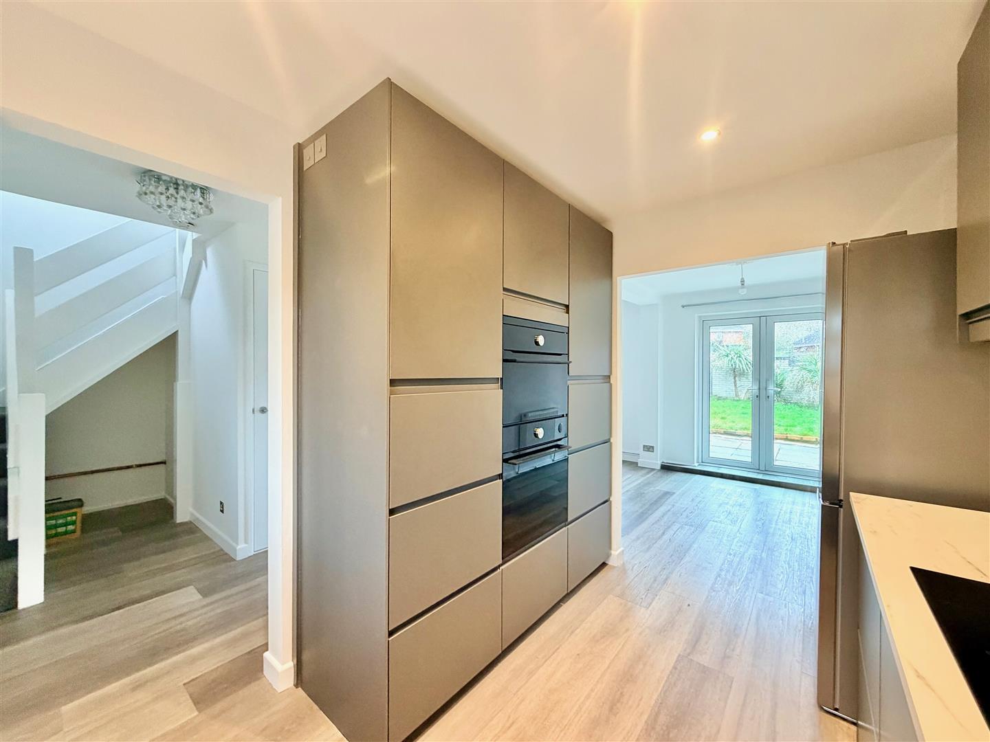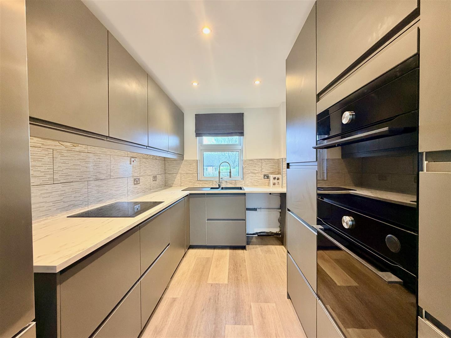 Range of modern base and wall-mounted cabinets with matching work surfaces and tiled splash-backs. One-&-a-half bowl single drainer sink unit. Built-in double oven and grill. Inset hob. Free-standing fridge-freezer. Space for washing machine. Integral dishwasher. Window to the front elevation.