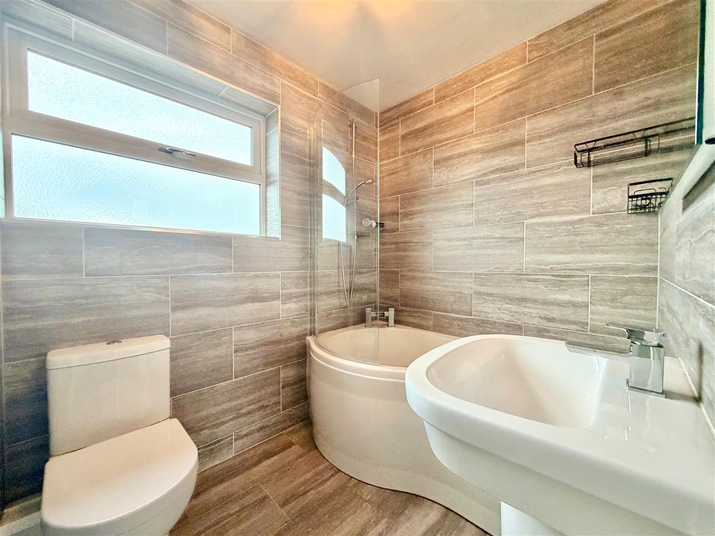 Comprising a bath with a shower system over and a curved glass screen, wc and pedestal basin. Chrome towel rail/radiator. Wall-mounted mirror with integral lighting. Fully-tiled walls. Tiled floor. Obscured window to the front elevation.