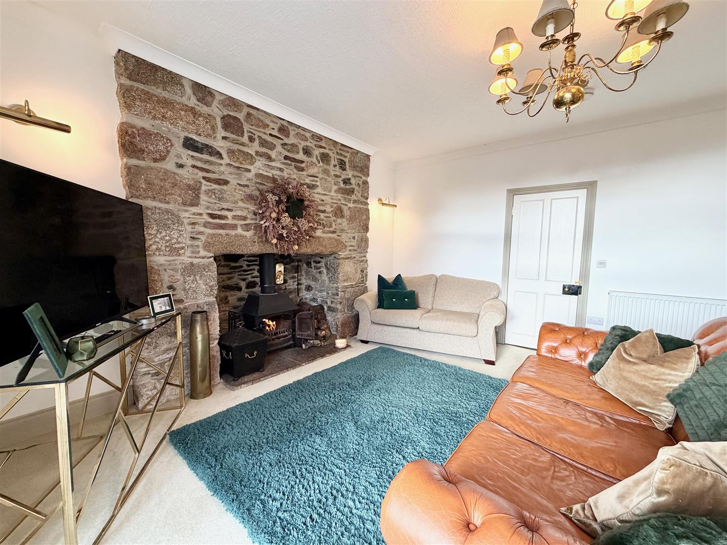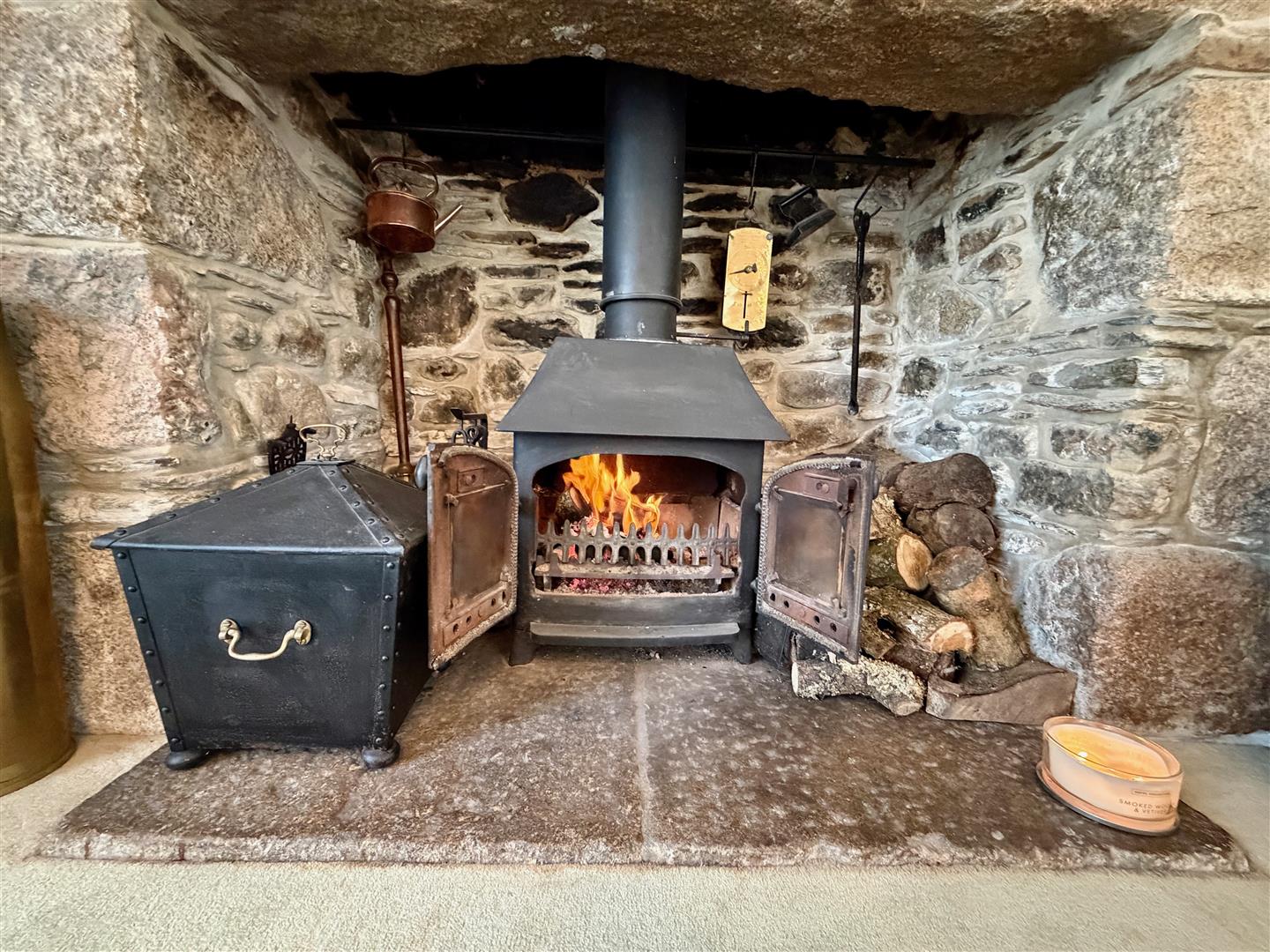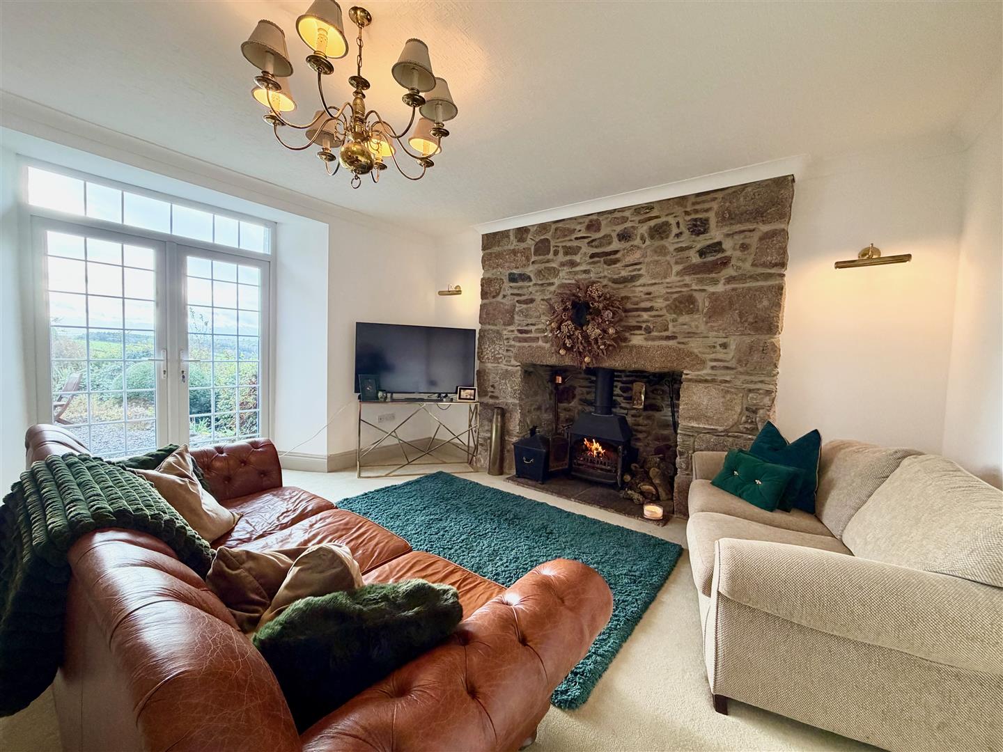 A spacious, attractive room with an original stone fireplace featuring a multi-fuel wood burning stove. French doors opening onto the formal gardens.