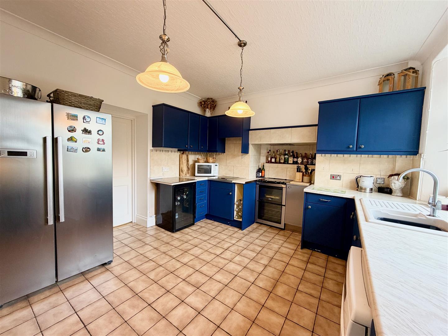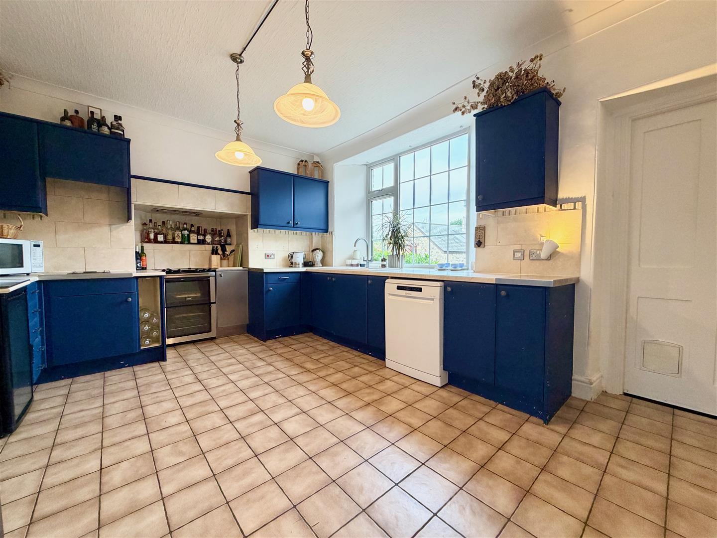 Fitted with a comprehensive range of matching base and wall-mounted cupboards incorporating roll-edged work surfaces with an inset one-&-a-half bowl ceramic sink unit and tiled splash-backs. Cooker with extractor canopy above. Indoor barbecue grill with brushed-steel surround. Built-in dishwasher. Space for a dining table and chairs. Ceramic tiled flooring. Window above the sink overlooking the front elevation. Staircase ascending to the first floor. Large built-in under-stairs cupboard/larder.