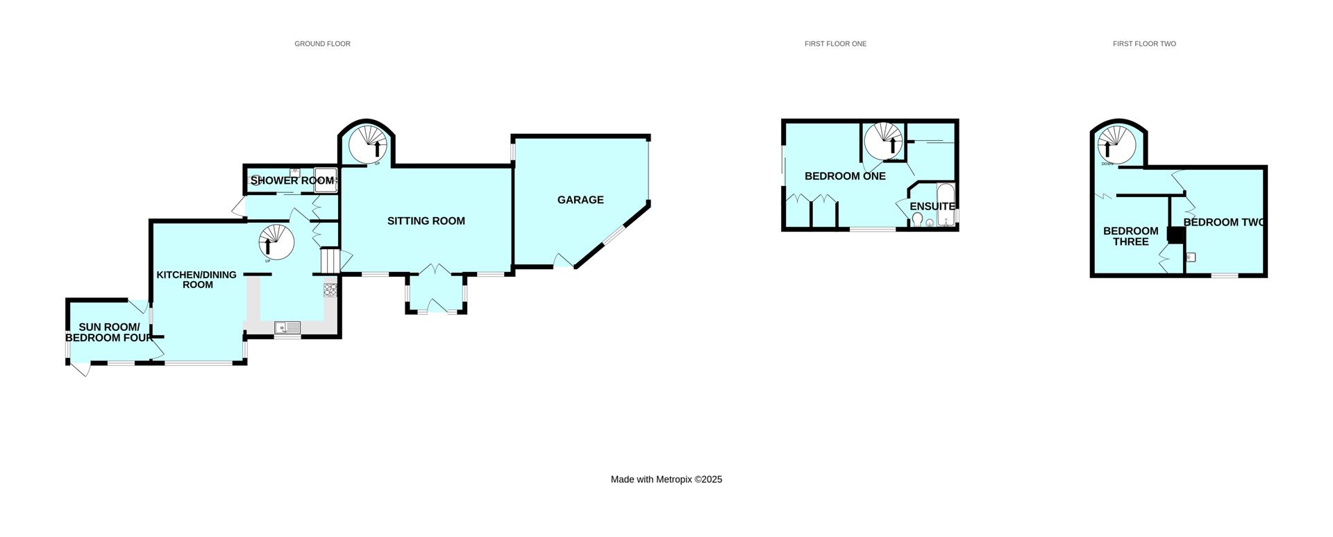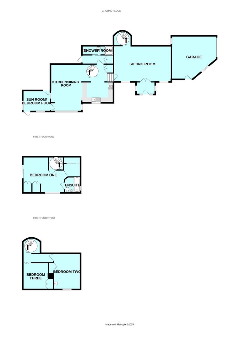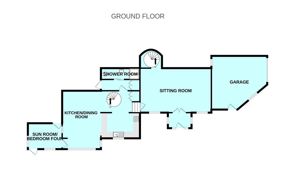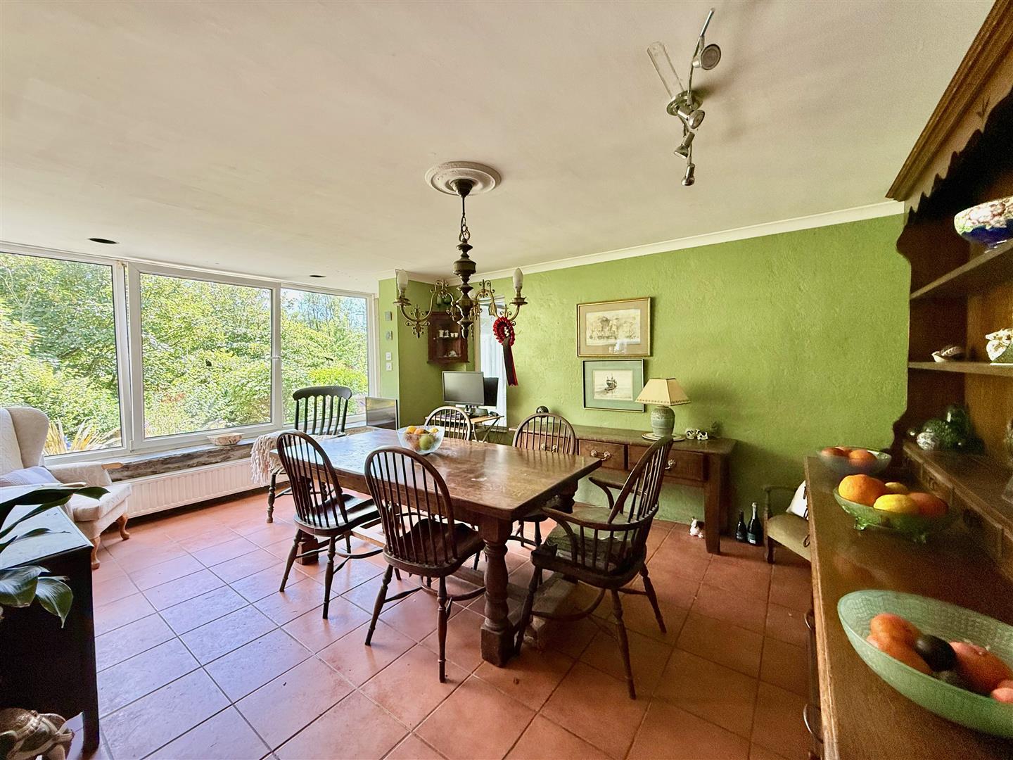 An open-plan room with ample space for dining table and chairs. Large bay window taking advantage of the garden views. The kitchen is fitted with a range of base and wall-mounted cabinets with oak fascias, work surfaces and tiled splash-backs. Stainless-steel single drainer sink unit. Built-in double oven and grill. Separate hob. Space for fridge. Over-head cupboard housing the electric meter and modern consumer unit. Recessed pantry with shelving. Tiled floor throughout. Window to the rear elevation overlooking the garden. Spiral staircase leading to the master bedroom. Doorway opening into the sun lounge. Doorway opening into the downstairs shower room/wc.