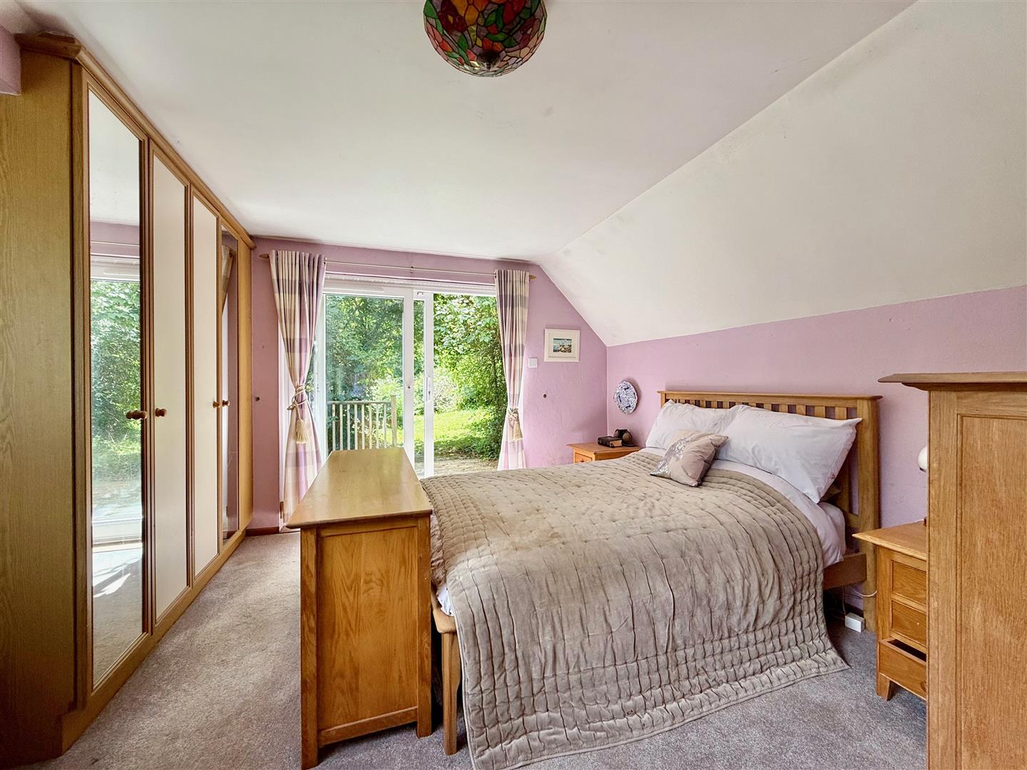 Accessed via it's own spiral staircase. The room is dual aspect with a window to the front elevation providing fabulous views over the garden towards woodland plus sliding double-glazed patio doors opening onto a decked patio, which in turn leads to the garden. Doorway opening into the bathroom.