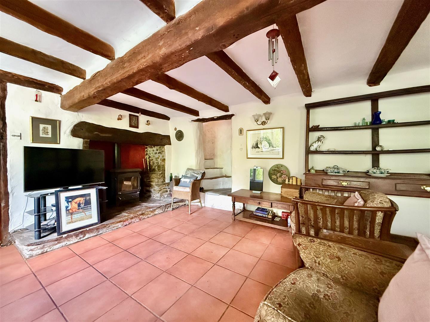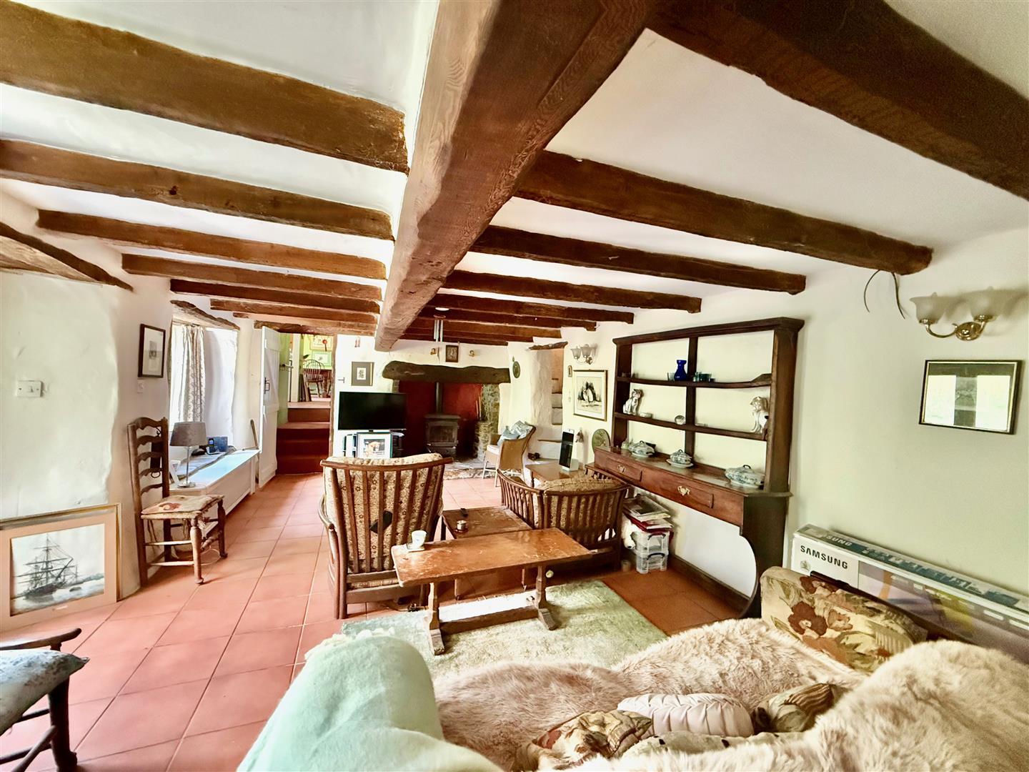 The living room has immense character with beamed ceilings and a beautiful stone fireplace on a stone hearth with a wood burner. Tiled floor throughout. Feature ceiling beams. Stone and slate staircase ascending to the first floor. 2 windows to the front elevation. Doorway providing access to the kitchen/dining room.