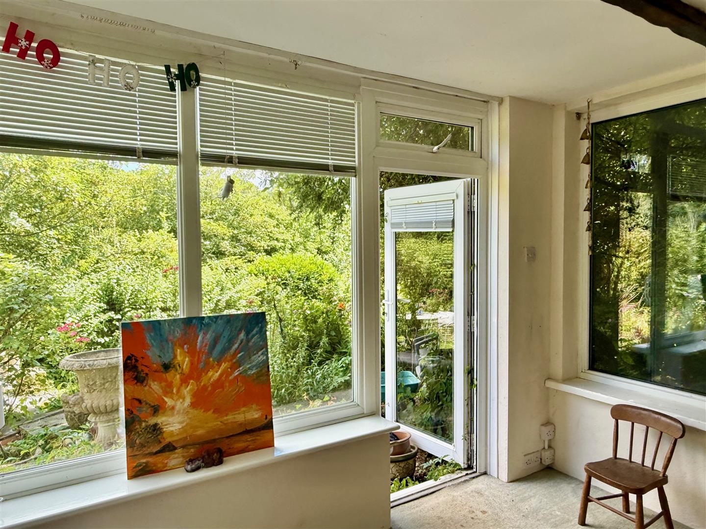 Windows to 2 elevations with lovely views over the garden. Ceiling beam. Doorway leading to outside.