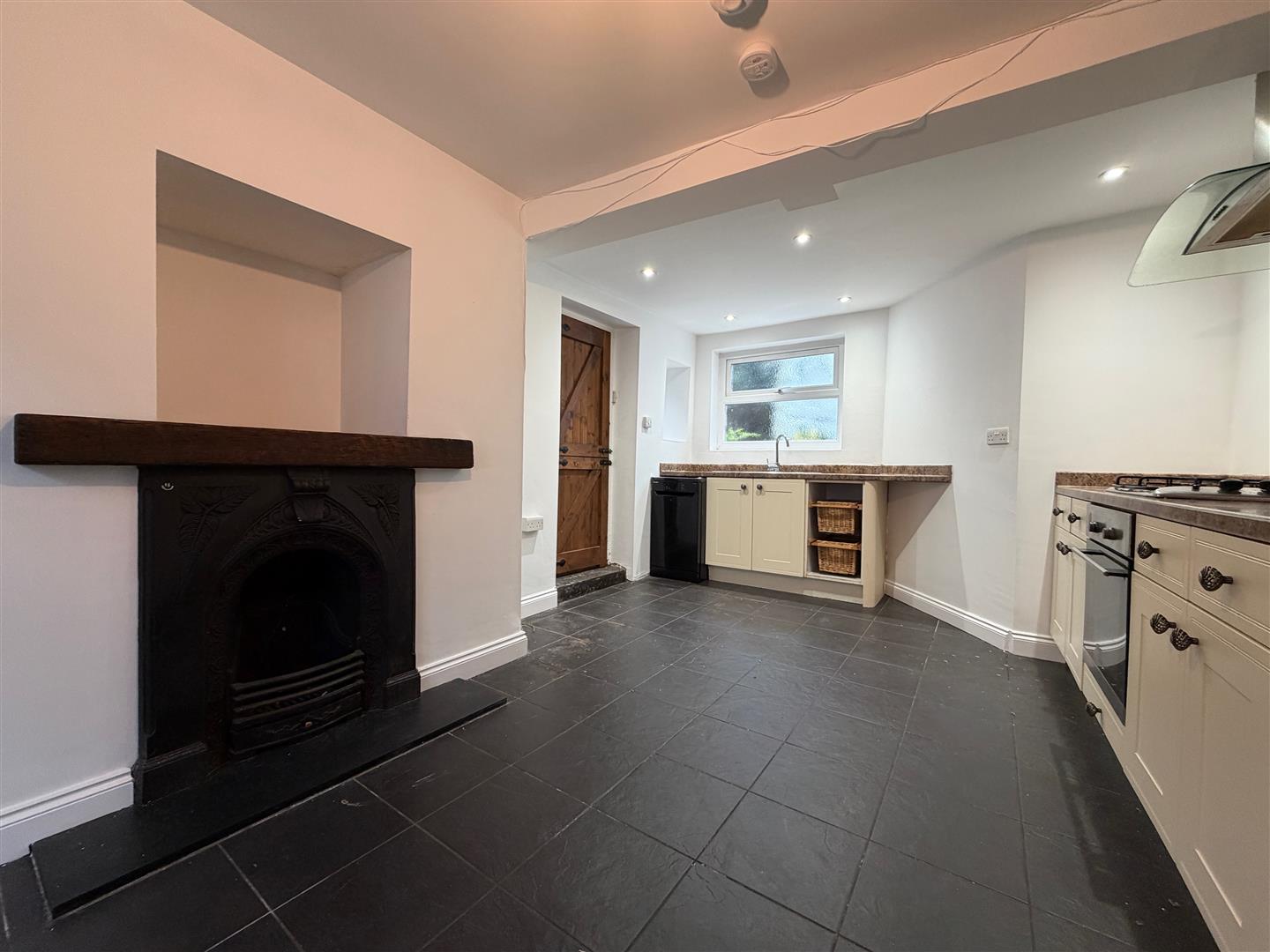 Dual aspect with a uPVC double-glazed sash window to the front and a uPVC double-glazed window with patterned glass to the rear overlooking the garden. Base units incorporating a roll-edged stone-effect laminate worktop with an inset 4-burner gas hob and stainless-steel extractor over, stainless-steel sink and mixer tap. Integrated oven. Space for a slimline dishwasher. Feature fireplace set upon a stone hearth with ornate surround. Wooden door opening to a lean-to/utility.