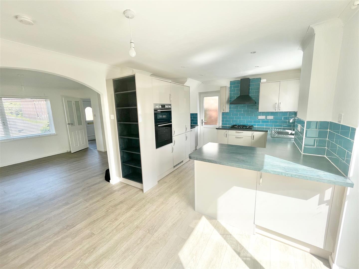 Within the dining area there are double-glazed sliding patio doors leading out onto the garden. Breakfast bar. Within the kitchen area there is a series of matching eye-level and base units with work surfaces and tiled splash-backs. Inset single drainer sink unit with mixer tap. 4-ring gas hob. Built-in electric double oven and grill. Integrated fridge-freezer. Built-in dishwasher. Washer-dryer. uPVC part double-glazed door to the side elevation. Double-glazed window to the rear elevation.