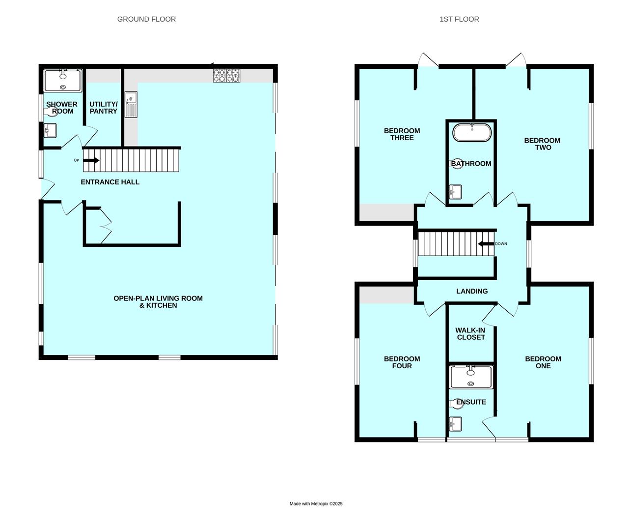 Comprising a generous walk-in shower with a fixed glass screen, wc and pedestal basin. Heated towel rail. Feature polished ply floor which continues into the utility/pantry. Obscured window to the rear elevation.