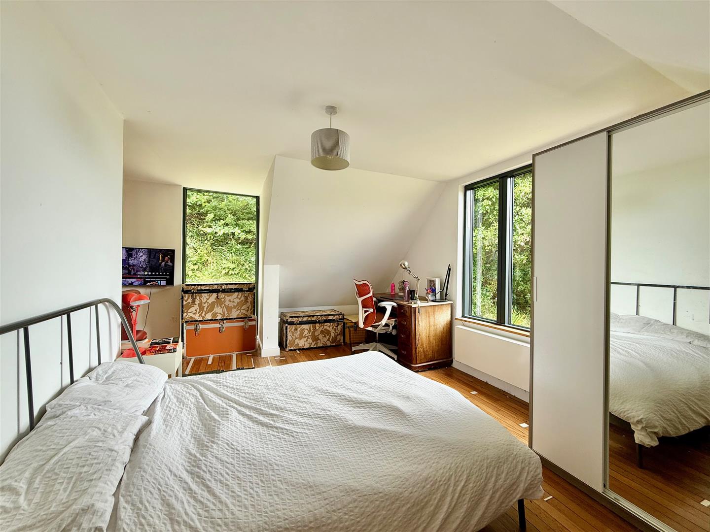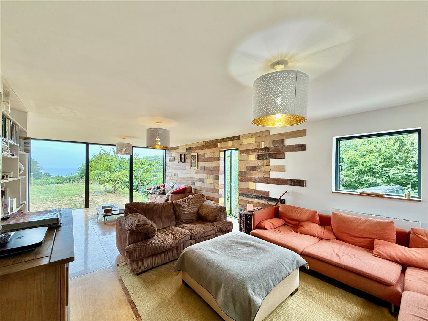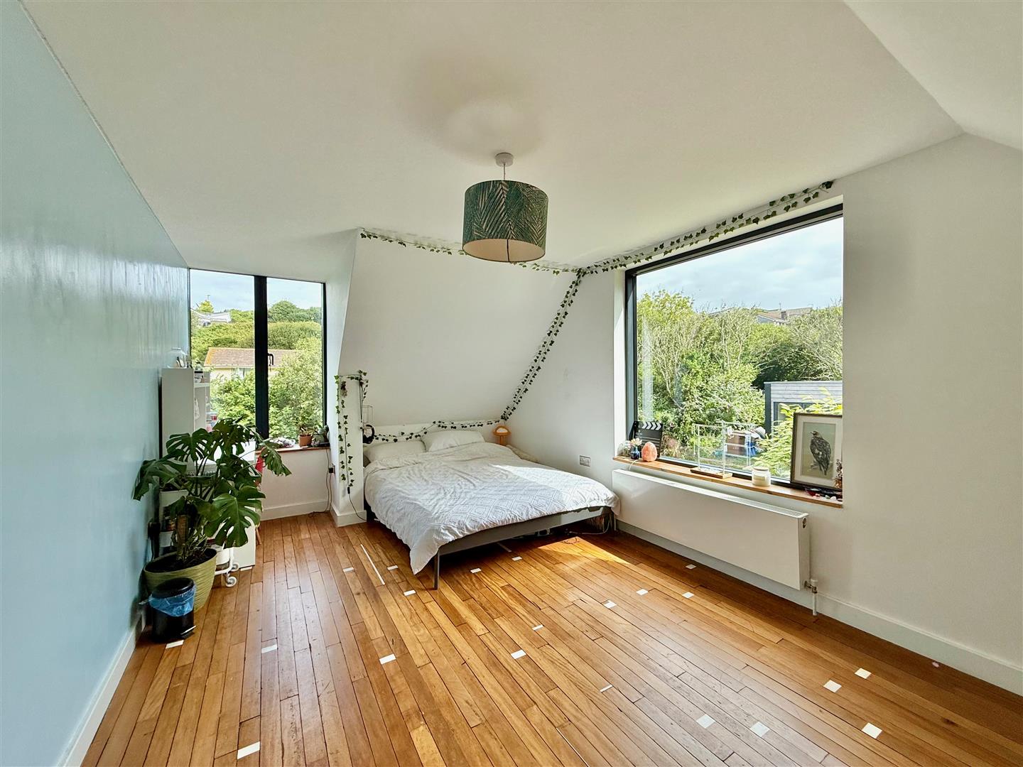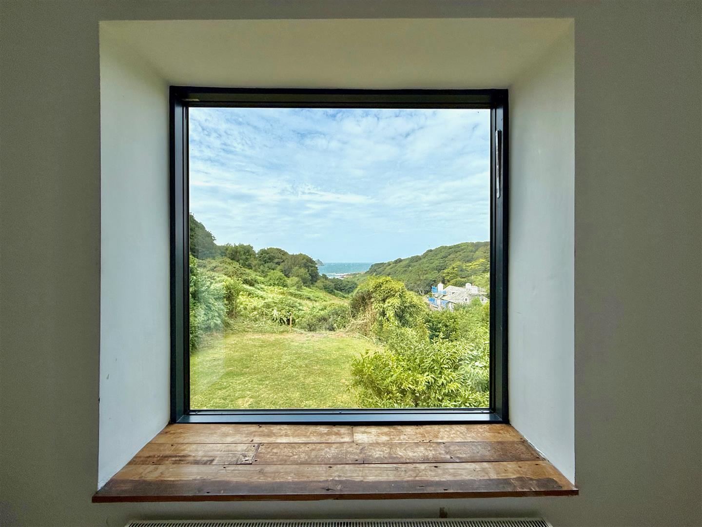 A dual aspect room with windows to the side and rear elevations. Lovely views from the rear down the valley towards the sea. Reclaimed sports hall oak flooring.