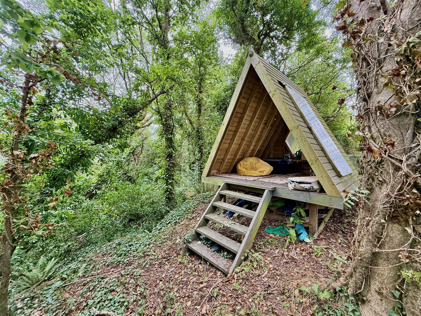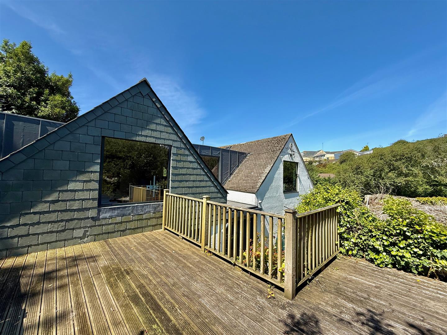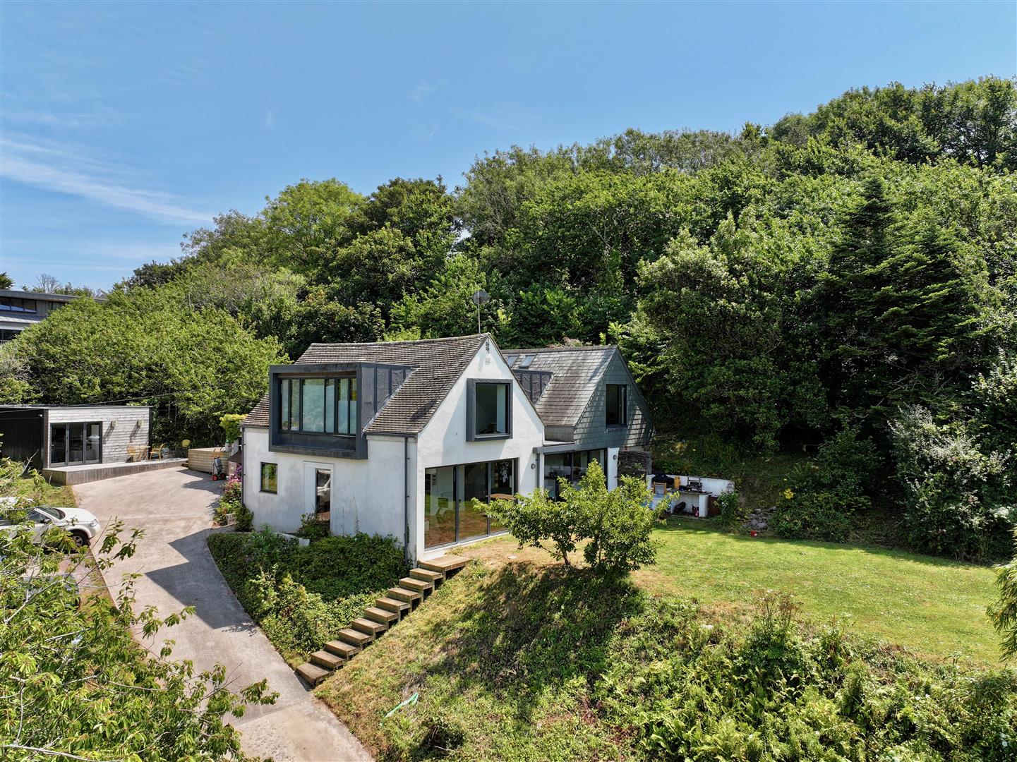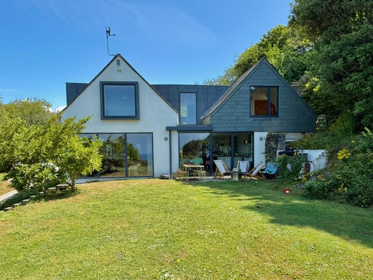 The house is approached via a driveway leading to the house and providing parking and access to the garage. Gardens and woodlands surround the house, totalling approximately one acre, providing a high degree of privacy and seclusion. There is a lawned area facing the sea to take advantage of the views together with decked patio areas to the front and side elevations of the property creating plentiful usable outside space. A woodland pathway provides access to a top level garden area, which features a timber cabin overlooking the woodland.