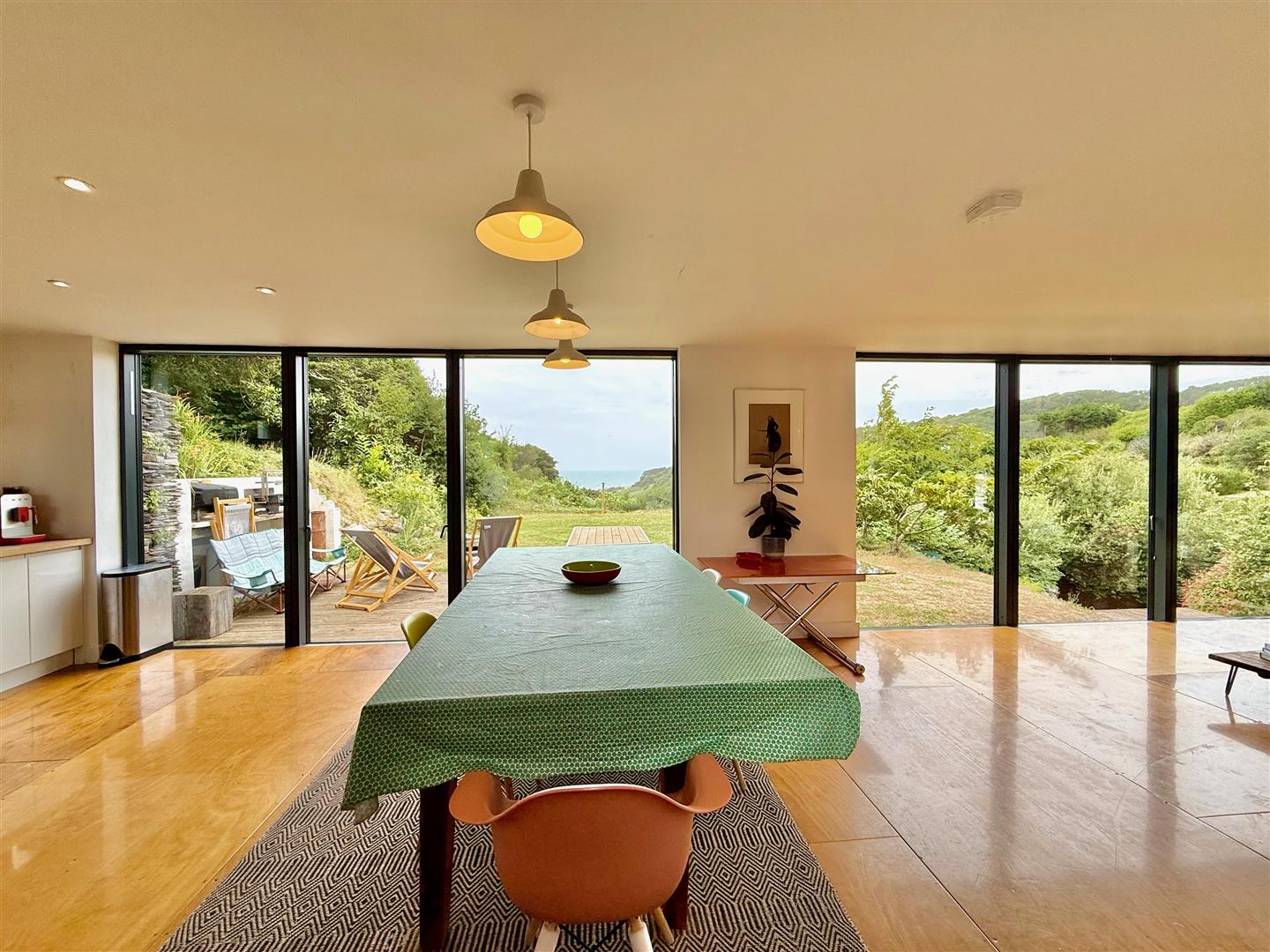 An open-plan triple aspect ground floor facing the sea with full height windows and doors to the rear elevation taking advantage of the wonderful position plus additional windows to the front and side elevations. Ample space for seating and entertaining. Space for a large dining room table and chairs. Base-mounted kitchen cabinets contrasted by oak wood work surfaces with glass splash-backs. Belfast-style porcelain sink with a feature mirror over. Caple stainless-steel Range-style cooker with 6 gas burners and a stainless-steel splash-back and cooker hood above. Space and plumbing for dishwasher. Space for an American-style fridge-freezer.